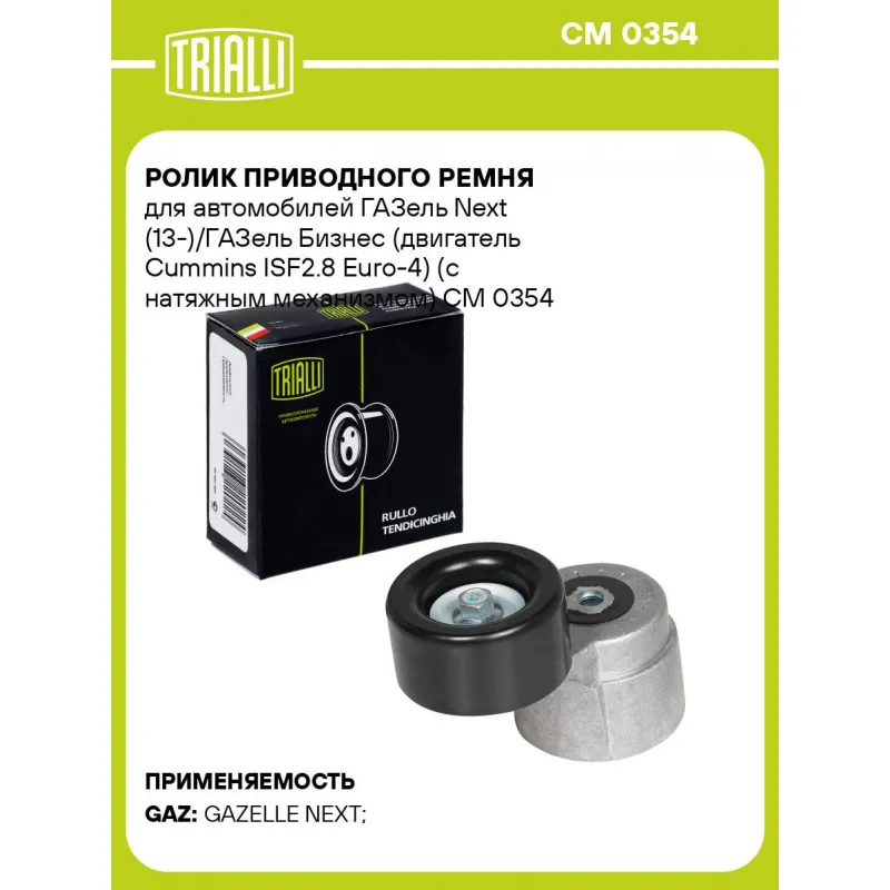 Ролик приводного ремня для автомобилей ГАЗель Next (13-)/ГАЗель Бизнес (двигатель Cummins ISF2.8 Euro-4) (с натяжным механизмом) Характеристики: Артикул: CM 0354 OEM номера: 5398362, 5332218, 5319042, 5398362F Сопутствующий товар: Ролики приводного ремня: CM 5066, CM 6216, CM 105, CM 106 Количество на автомобиль: 1 Внешний диаметр, мм: 70 Внутренний диаметр, мм: 10,2 Ширина, мм: 36,5 Гарантийный срок: 2 года/60 000 км. Сопутствующий товар: Ремни: 8PK2155, 8PK2166, PK2450, 8PK2495, 8PK2475, 8PK2585 Товарная линейка: BLACK Комплектация: Ролик привод. ремня с натяж. мех - 1 шт Гарантия: от 1 года.