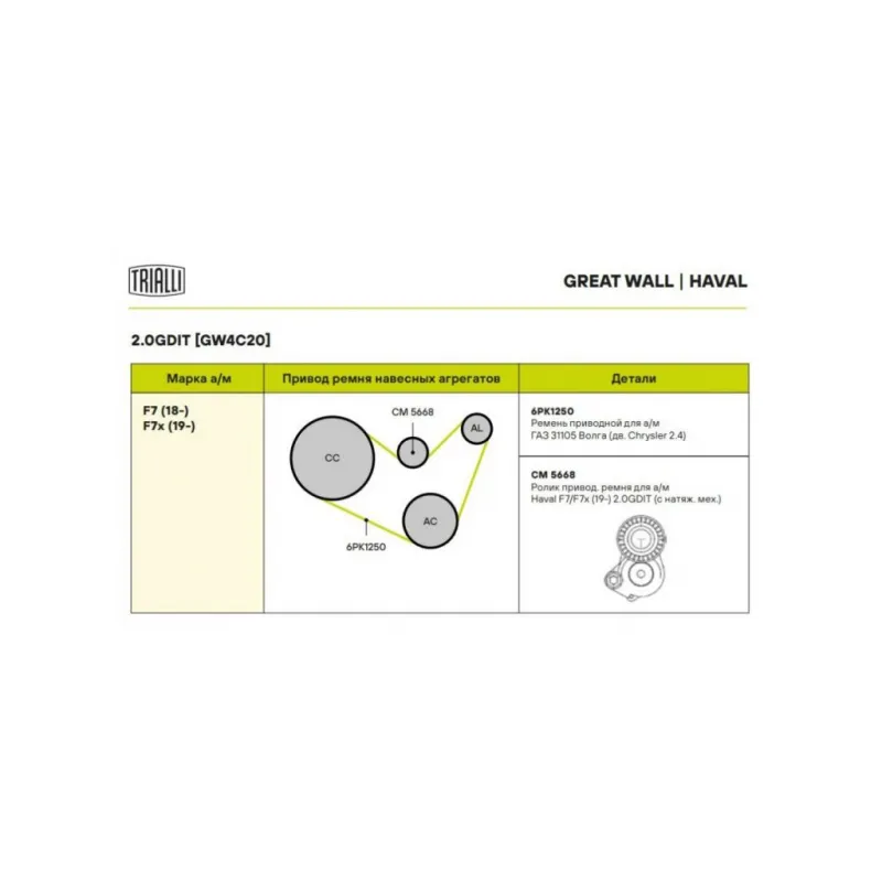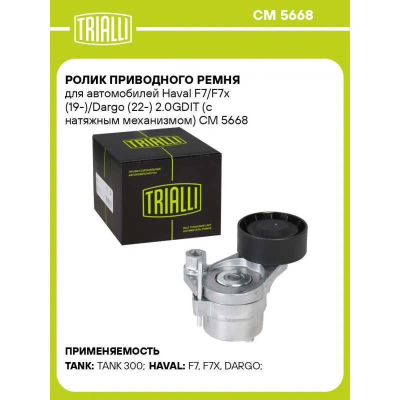 Ролик приводного ремня для автомобилей Haval F7/F7x (19-)/Dargo (22-) 2.0GDIT (с натяжным механизмом) Характеристики: Артикул: CM 5668 OEM номера: 1025100XEC06 Внешний диаметр, мм: 65 Сопутствующий товар: Ремни: 6PK1250 Количество на автомобиль: 1 Ширина, мм: 26 Гарантийный срок: 2 года/60 000 км. Материал: Комбинированный Товарная линейка: BLACK Комплектация: Ролик привод. ремня с натяж. мех. - 1 шт Гарантия: от 1 года.