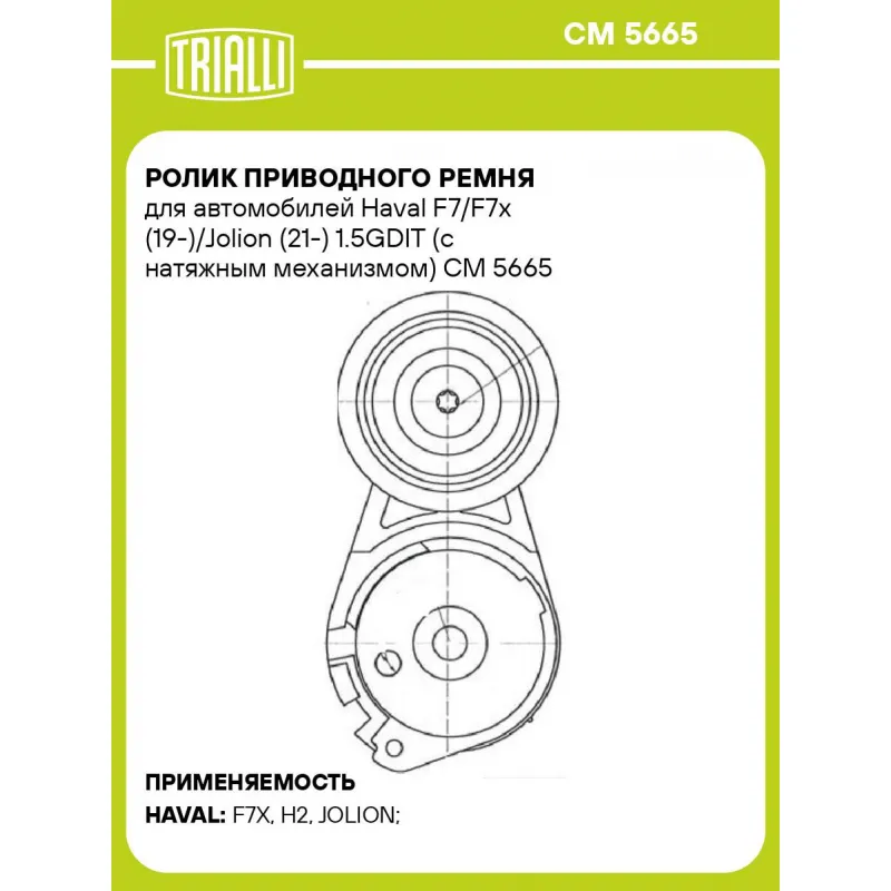 Ролик приводного ремня для автомобилей Haval F7/F7x (19-)/Jolion (21-) 1.5GDIT (с натяжным механизмом) Характеристики: Артикул: CM 5665 OEM номера: 1025100XEB12 Внутренний диаметр, мм: 7,6 Сопутствующий товар: Ролики приводного ремня: CM 5666 Сопутствующий товар: Ремни: 6PK1548 Количество на автомобиль: 1 Внешний диаметр, мм: 67 Ширина, мм: 25 Гарантийный срок: 2 года/60 000 км. Материал: Комбинированный Товарная линейка: BLACK Комплектация: Ролик привод. ремня с натяж. мех. - 1 шт Гарантия: от 1 года.
