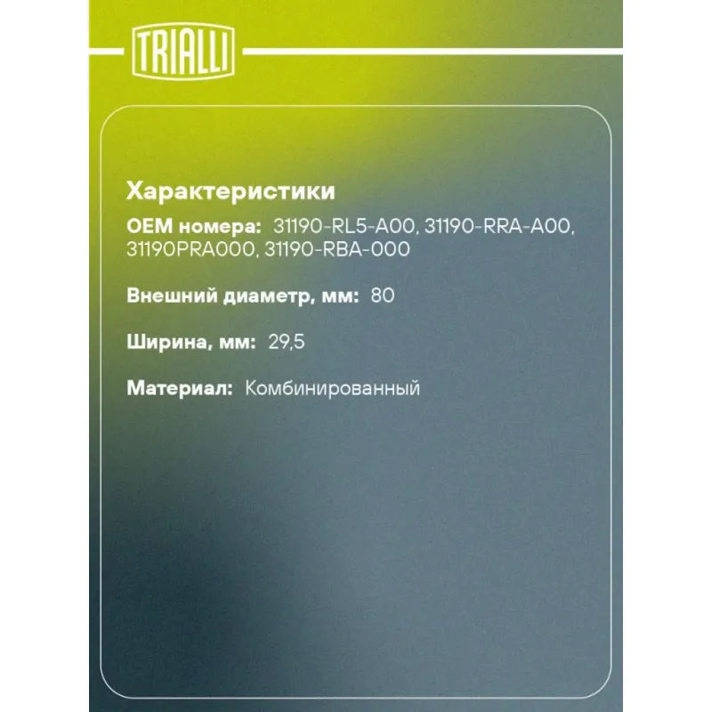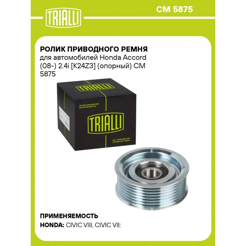 Ролик приводного ремня для автомобилей Honda Accord (08-) 2.4i [K24Z3] (опорный) Характеристики: Артикул: CM 5875 OEM номера: 31190-RL5-A00, 31190-RRA-A00, 31190PRA000, 31190-RBA-000 Сопутствующий товар: Ролики приводного ремня: CM 5394 Сопутствующий товар: Ремни: 7PK1715 Количество на автомобиль: 1 Внешний диаметр, мм: 80 Внутренний диаметр, мм: 17 Ширина, мм: 29,5 Гарантийный срок: 2 года/60 000 км. Материал: Комбинированный Товарная линейка: BLACK Комплектация: Ролик приводного ремня - 1 шт Гарантия: от 1 года.