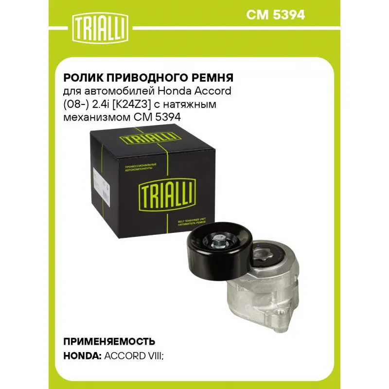 Ролик приводного ремня для автомобилей Honda Accord (08-) 2.4i [K24Z3] с натяжным механизмом Характеристики: Артикул: CM 5394 OEM номера: 31170R40A01, 31170R40A02, 31170-RLF-J01 Сопутствующий товар: Ролики приводного ремня: CM 5875 Сопутствующий товар: Ремни: 7PK1715 Количество на автомобиль: 1 Внешний диаметр, мм: 76,5 Внутренний диаметр, мм: 8,2 Ширина, мм: 37 Гарантийный срок: 2 года/60 000 км. Материал: Комбинированный Товарная линейка: BLACK Комплектация: Ролик привод. ремня с натяж. мех. - 1 шт Гарантия: от 1 года.