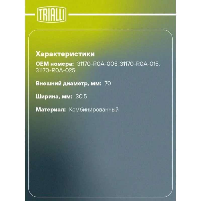 Ролик приводного ремня для автомобилей Honda Civic IX (11-) / CR-V IV(12-) 1.8i/2.0i [R18; R20] (с натяжным механизмом) Характеристики: Артикул: CM 7108 OEM номера: 31170-R0A-005, 31170-R0A-015, 31170-R0A-025 Ширина, мм: 30.5 Внешний диаметр, мм: 70 Гарантийный срок: 2 года/60 000 км. Товарная линейка: BLACK Количество на автомо... Читать полностью →