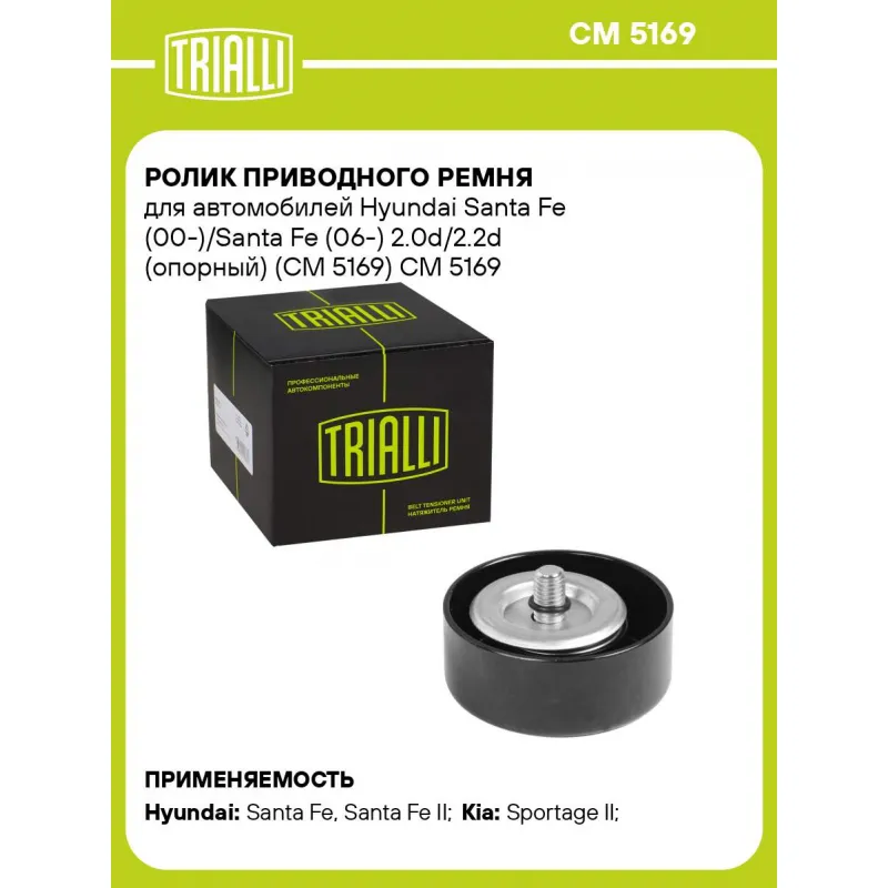 Ролик приводного ремня для автомобилей Hyundai Santa Fe (00-)/Santa Fe (06-) 2.0d/2.2d (опорный) (CM 5169) Характеристики: Артикул: CM 5169 OEM номера: 2528727400, 25287-27001, 2528727000 Сопутствующий товар: Ролики приводного ремня: CM 5188, CM 5132 Количество на автомобиль: 1 Внешний диаметр, мм: 70 Внутренний диаметр, мм: 10 Ширина, мм: 28 Гарантийный срок: 2 года/60 000 км. Материал: Металл Сопутствующий товар: Ремни: 6PK1510, 6PK1515 Товарная линейка: BLACK Подходит для авто: Hyundai Santa Fe (00-), Santa Fe II (06-), Santa Fe II (06-), Tucson I (04-) Kia Sportage II (04-) Для проверки применяемости отправьте VIN автомобиля через вкладку "Есть вопросы о товаре?" Комплектация: Ролик привод. ремня - 1 шт Гарантия: от 1 года.