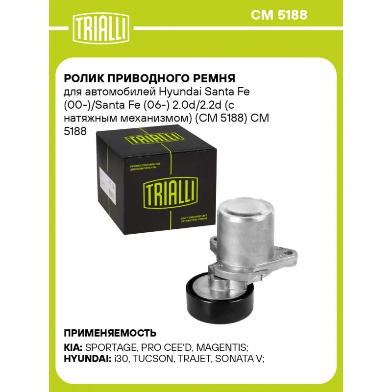 Ролик приводного ремня для автомобилей Hyundai Santa Fe (00-)/Santa Fe (06-) 2.0d/2.2d (с натяжным механизмом) (CM 5188) Характеристики: Артикул: CM 5188 OEM номера: 25281-27-000, 25281-27001, 25281-27-010, 25281-27-060, 2528127400, 2528127401, 2528127001 Сопутствующий товар: Ролики приводного ремня: CM 5169, CM 5132 Количество на автомобиль: 1 Внешний диаметр, мм: 70,00 Внутренний диаметр, мм: 8,2 Ширина, мм: 27.5 Гарантийный срок: 2 года/60 000 км. Материал: металл/пластик Сопутствующий товар: Ремни: 6PK1510, 6PK1515 Товарная линейка: BLACK Тип ролика: ГРМ Комплектация: Ролик привод. ремня с натяж. мех. - 1 шт Гарантия: от 1 года.