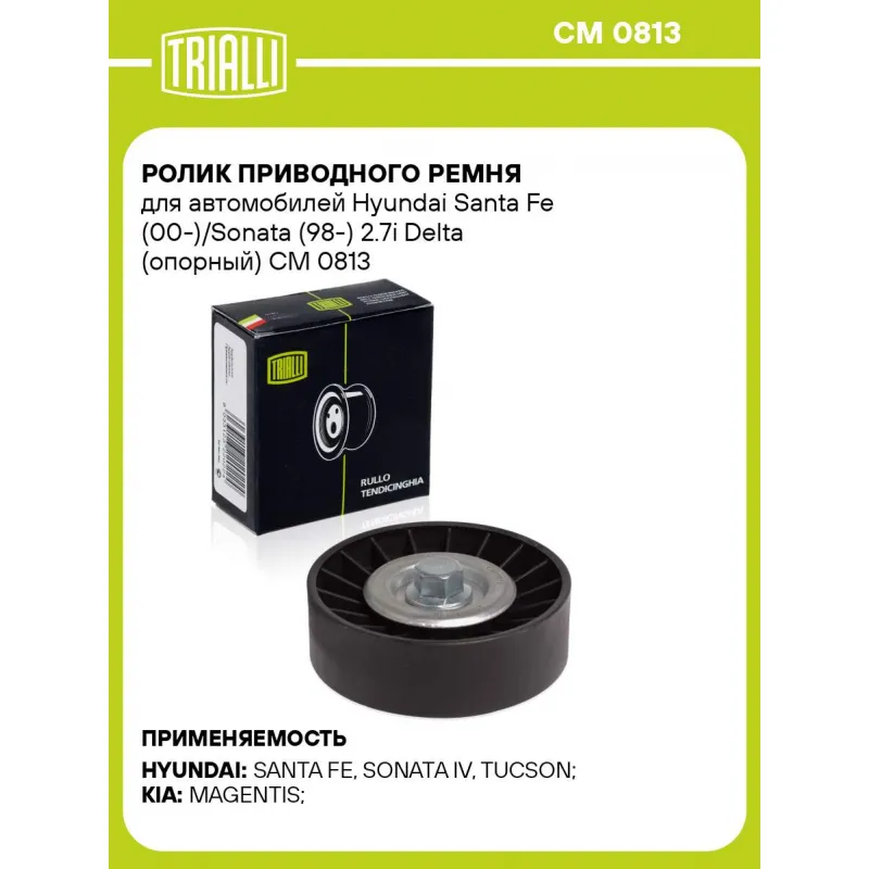 Ролик приводного ремня для автомобилей Hyundai Santa Fe (00-)/Sonata (98-) 2.7i Delta (опорный) Характеристики: Артикул: CM 0813 OEM номера: 25286-37-100, 2528637110, 25286-37100, 2528737110, 2528737101 Сопутствующий товар: Ролики приводного ремня: CM 5180 Количество на автомобиль: 1 Внешний диаметр, мм: 83 Внутренний диаметр, мм: 17 Ширина, мм: 26 Гарантийный срок: 2 года/60 000 км. Материал: Комбинированный Сопутствующий товар: Ремни: 6PK1690, 6PK1693, 6PK2000 Товарная линейка: BLACK Комплектация: Ролик приводной ремня - 1 шт Гарантия: от 1 года.