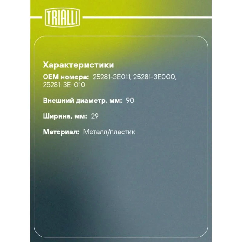Ролик приводного ремня для автомобилей Hyundai Santa Fe (06-) 2.7i (только ролик натяжителя) Характеристики: Артикул: CM 5546 OEM номера: 25281-3E011, 25281-3E000, 25281-3E-010 Сопутствующий товар: Ролики приводного ремня: CM 5347, CM 3039 Количество на автомобиль: 1 Внешний диаметр, мм: 90 Внутренний диаметр, мм: 10,2 Ширина, мм: 29 Гарантийный срок: 2 года/60 000 км. Материал: металл/пластик Сопутствующий товар: Ремни: 6PK2055 Товарная линейка: BLACK Комплектация: Ролик приводного ремня - 1 шт Гарантия: от 1 года.