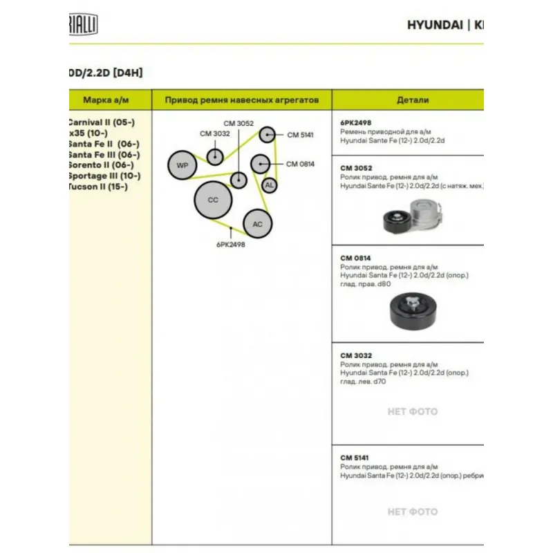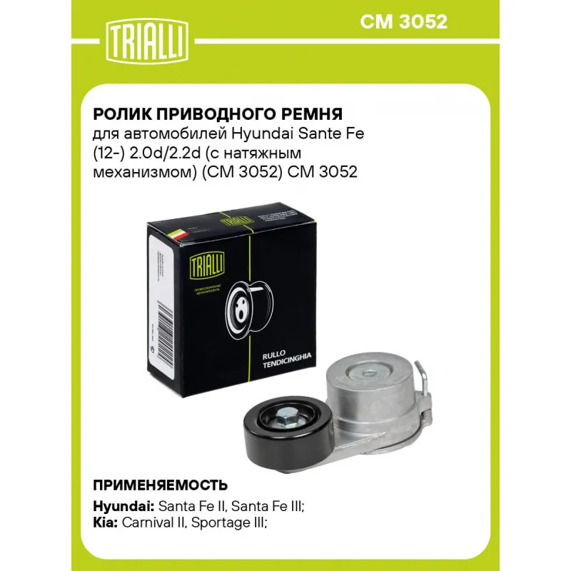 Ролик приводного ремня для автомобилей Hyundai Sante Fe (12-) 2.0d/2.2d (с натяжным механизмом) (CM 3052) Характеристики: Артикул: CM 3052 OEM номера: 25281-2F000, 25281-2F001, 25281-2F002 Сопутствующий товар: Ролики приводного ремня: CM 0814, CM 3032, CM 5141 Количество на автомобиль: 1 Внешний диаметр, мм: 65 Внутренний диаметр, мм: 10 Ширина, мм: 27 Гарантийный срок: 2 года/60 000 км. Материал: Комбинированный Сопутствующий товар: Ремни: 6PK2498 Товарная линейка: BLACK Подходит для авто: Hyundai Santa Fe II (06-), Santa Fe II (06-), Santa Fe III (12-), iX35 (10-) Kia Carnival II (06-), Sportage III (10-) Для проверки применяемости отправьте VIN автомобиля через вкладку "Есть вопросы о товаре?" Комплектация: Ролик привод. ремня с натяж. мех. - 1 шт Гарантия: от 1 года.