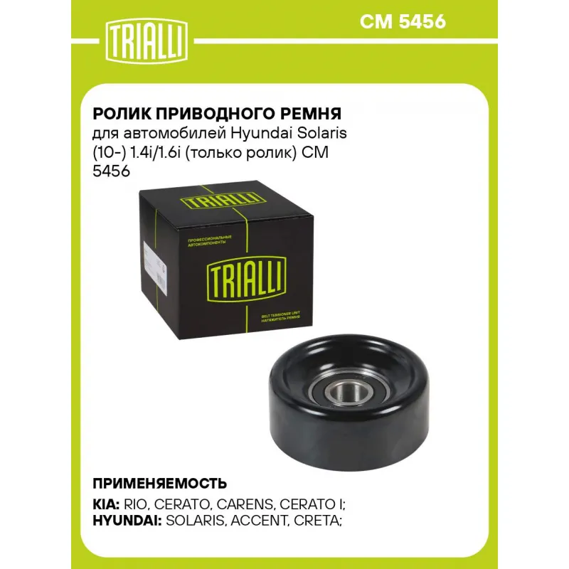 Ролик приводного ремня для автомобилей Hyundai Solaris (10-) 1.4i/1.6i (только ролик) Характеристики: Артикул: CM 5456 OEM номера: 2528128010, 252812B010, 252812B020, 252812B030, 25281-2B000, 25281-2B010, 25281-2B020 Сопутствующий товар: Ролики приводного ремня: CM 0801, CM 0802, CM 5734 Количество на автомобиль: 1 Внешний диаметр, мм: 76 Внутренний диаметр, мм: 10 Ширина, мм: 31 Гарантийный срок: 2 года/60 000 км. Сопутствующий товар: Ремни: 6PK2138, 6PK2140, 6PK1530, 6PK1256 Товарная линейка: BLACK Комплектация: Ролик приводного ремня - 1 шт Гарантия: от 1 года.