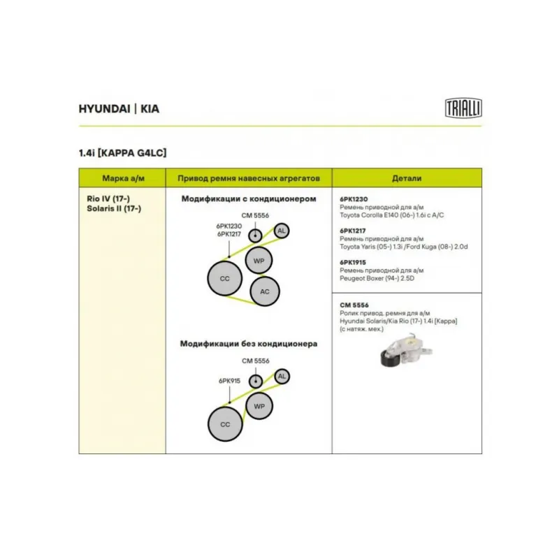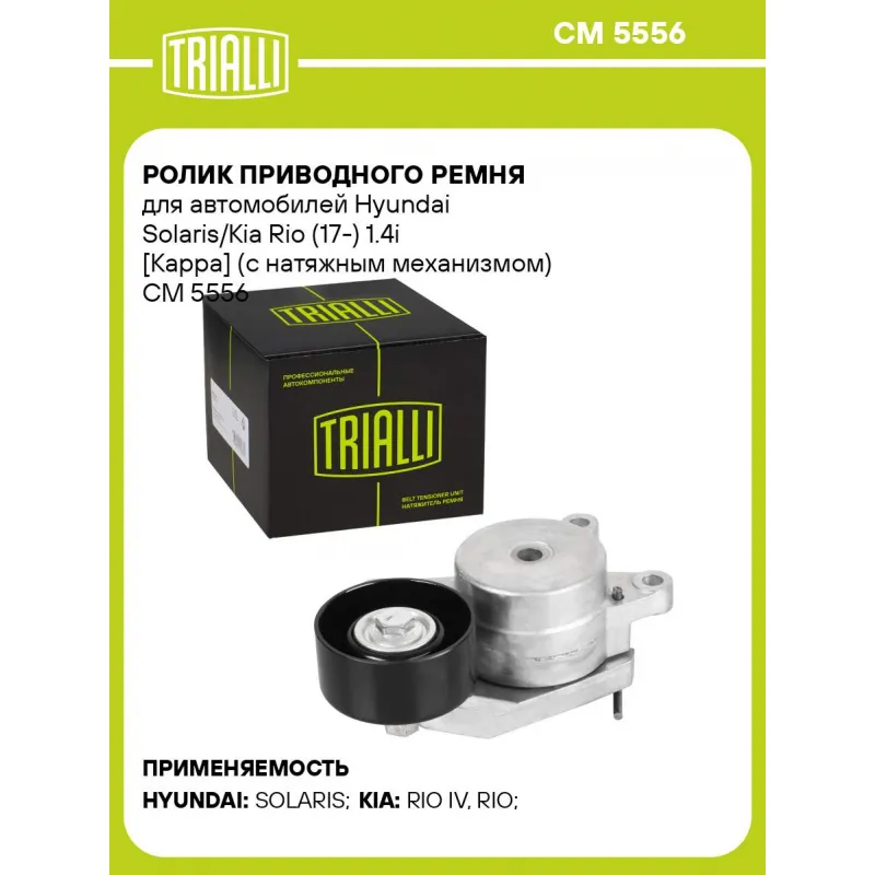 Ролик приводного ремня для автомобилей Hyundai Solaris/Kia Rio (17-) 1.4i [Kappa] (с натяжным механизмом) Характеристики: Артикул: CM 5556 OEM номера: 25281-04600 Количество на автомобиль: 1 Внешний диаметр, мм: 65 Ширина, мм: 31 Гарантийный срок: 2 года/60 000 км. Сопутствующий товар: Ремни: 6PK1230, 6PK1217, 6PK1915 Товарная л... Читать полностью →
