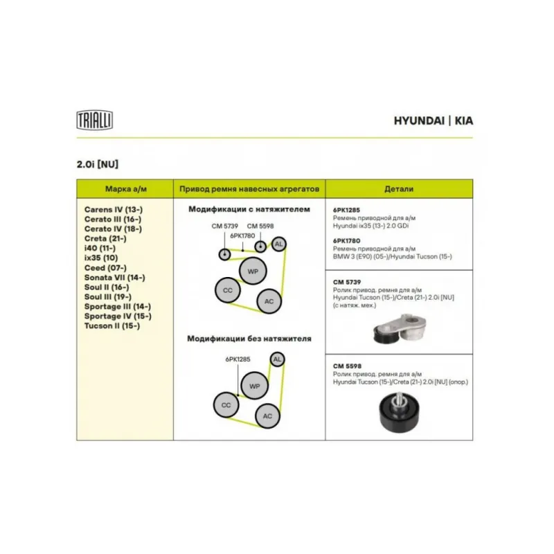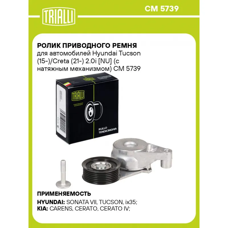 Ролик приводного ремня для автомобилей Hyundai Tucson (15-)/Creta (21-) 2.0i [NU] (с натяжным механизмом) Характеристики: Артикул: CM 5739 OEM номера: 25281-2E300, 25281-2J001, 25281-2E350 Сопутствующий товар: Ролики приводного ремня: CM 5598 Количество на автомобиль: 1 Внешний диаметр, мм: 69 Ширина, мм: 26 Гарантийный срок: 2 года/60 000 км. Сопутствующий товар: Ремни: 6PK1285, 6PK1780 Товарная линейка: BLACK Комплектация: Ролик приводного ремня - 1 шт Гарантия: от 1 года.