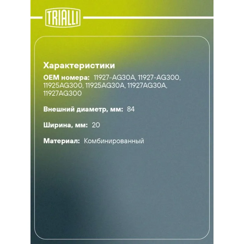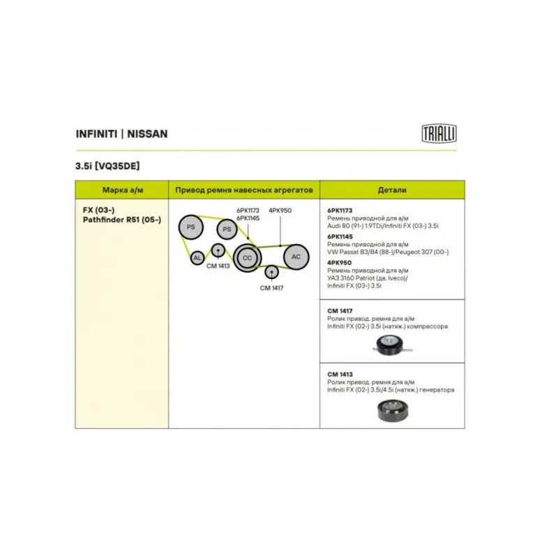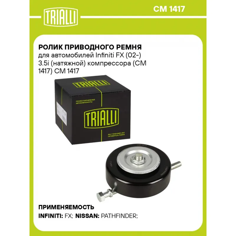 Ролик приводного ремня для автомобилей Infiniti FX (02-) 3.5i (натяжной) компрессора (CM 1417) Характеристики: Артикул: CM 1417 OEM номера: 11927-AG30A, 11927-AG300, 11925AG300, 11925AG30A, 11927AG30A, 11927AG300 Количество на автомобиль: 1 Внешний диаметр, мм: 84 Внутренний диаметр, мм: 12 Ширина, мм: 20 Гарантийный срок: 2 год... Читать полностью →