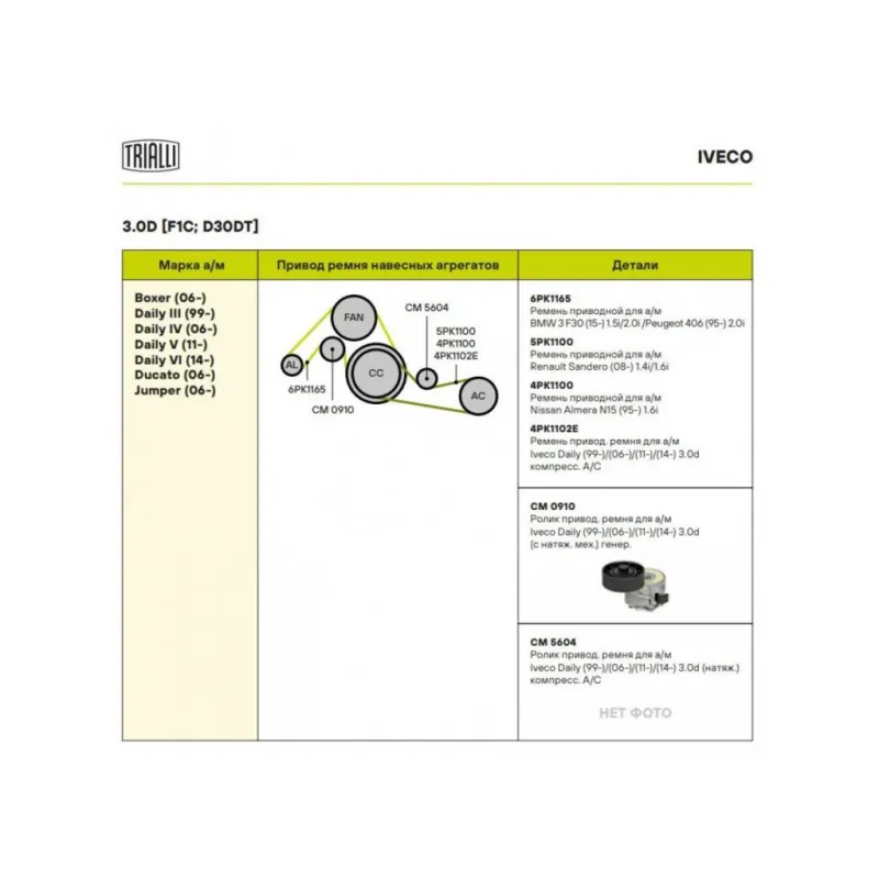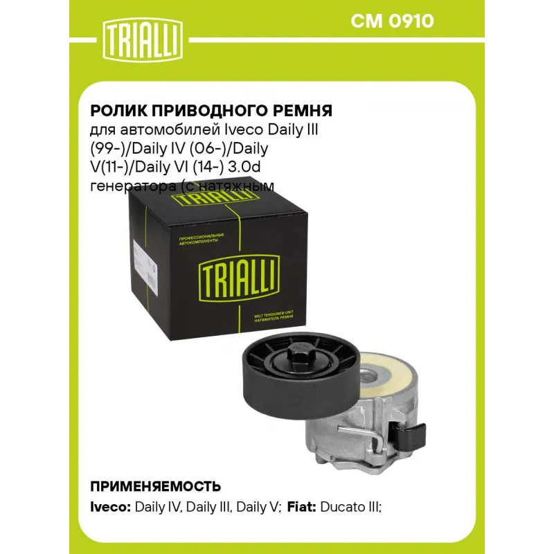 Ролик приводного ремня для автомобилей Iveco Daily III (99-)/Daily IV (06-)/Daily V(11-)/Daily VI (14-) 3.0d генератора (с натяжным механизмом) Характеристики: Артикул: CM 0910 OEM номера: 0818.38, 504086948, 16114238, 1611423880 Сопутствующие товары:: 6PK1165, 5PK1100, 4PK1100, 4PK1102E, CM 5604 Сопутствующий товар: Ролики приводного ремня: CM 5604 Количество на автомобиль: 1 Внешний диаметр, мм: 70 Внутренний диаметр, мм: 10 Ширина, мм: 25 Гарантийный срок: 2 года/60 000 км. Сопутствующий товар: Ремни: 6PK1165, 5PK1100, 4PK1100, 4PK1102E Товарная линейка: BLACK Подходит для авто: Iveco Daily IV (06-), Daily III (99-), Daily V (11-), Daily VI (14-) Fiat Ducato III (06-) Для проверки применяемости отправьте VIN автомобиля через вкладку "Есть вопросы о товаре?" Комплектация: Ролик привод. ремня с натяж. мех. - 1 шт Гарантия: от 1 года.