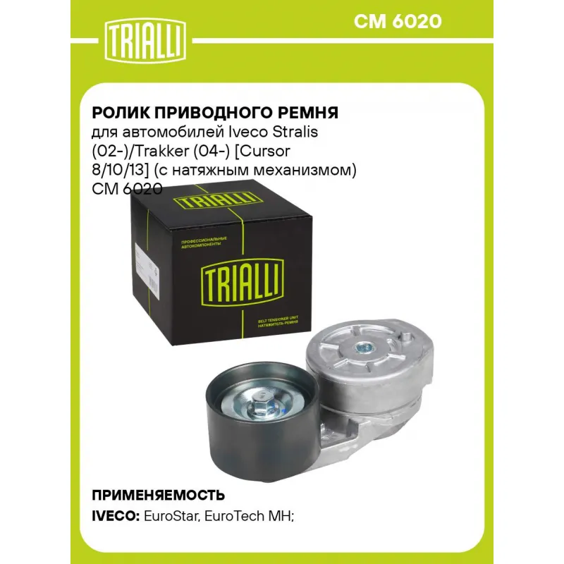 Ролик приводного ремня для автомобилей Iveco Stralis (02-)/Trakker (04-) [Cursor 8/10/13] (с натяжным механизмом) Характеристики: Артикул: CM 6020 OEM номера: 504046191, 99436331, 99471920 Ширина, мм: 46 Внешний диаметр, мм: 74 Внутренний диаметр, мм: 10,4 Гарантийный срок: 2 года/60 000 км. Количество на автомобиль: 1 Материал:... Читать полностью →
