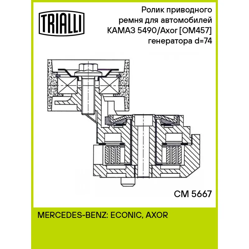 Ролик приводного ремня для автомобилей КАМАЗ 5490/Axor [ОМ457] (с натяжным механизмом) генератора d=74 Характеристики: Артикул: CM 5667 OEM номера: A4572001470, A4572000270, 4572001470, 4572000270 Товарная линейка: BLACK Количество на автомобиль: 1 Гарантийный срок: 2 года/60 000 км. Материал: Комбинированный Комплектация: Ролик приводного ремня - 1 шт Гарантия: от 1 года.