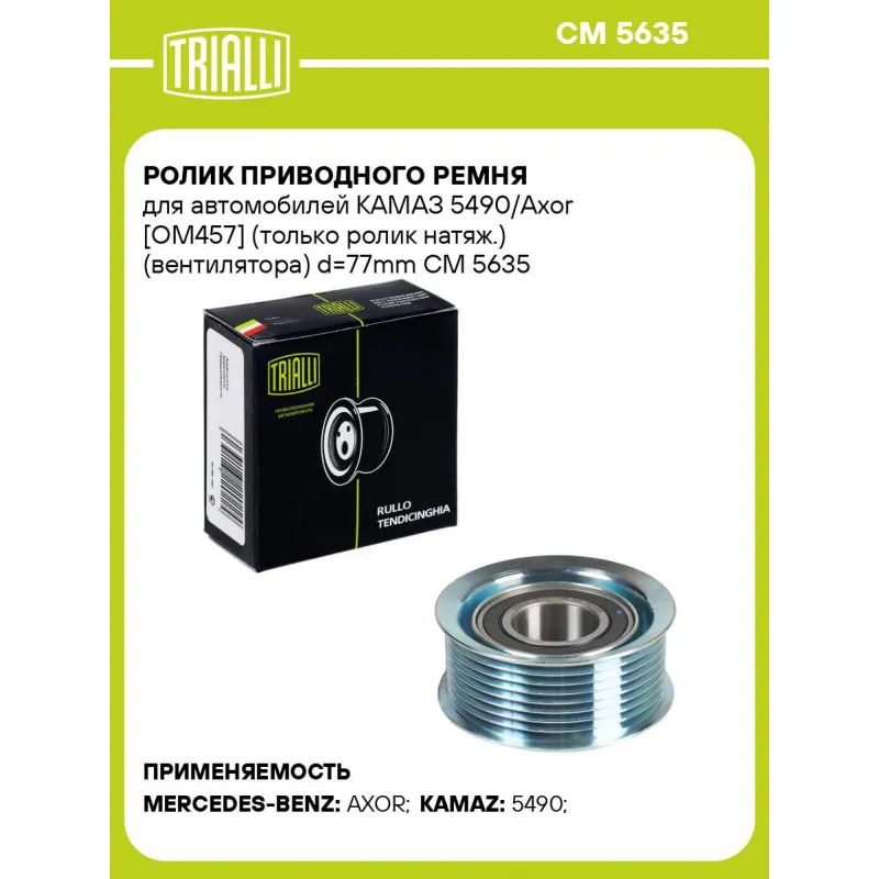 Ролик приводного ремня для автомобилей КАМАЗ 5490/Axor [ОМ457] (только ролик натяж.) (вентилятора) d=77mm Характеристики: Артикул: CM 5635 OEM номера: A4572004470, A4572004270, A4572003070, 4572004470, 4572004270, 4572003070 Сопутствующие товары:: CM 5656 Сопутствующий товар: Ролики приводного ремня: CM 5656 Количество на автомобиль: 1 Внешний диаметр, мм: 77 Ширина, мм: 38 Гарантийный срок: 2 года/60 000 км. Товарная линейка: BLACK Комплектация: Ролик привод. ремня - 1 шт Гарантия: от 1 года.