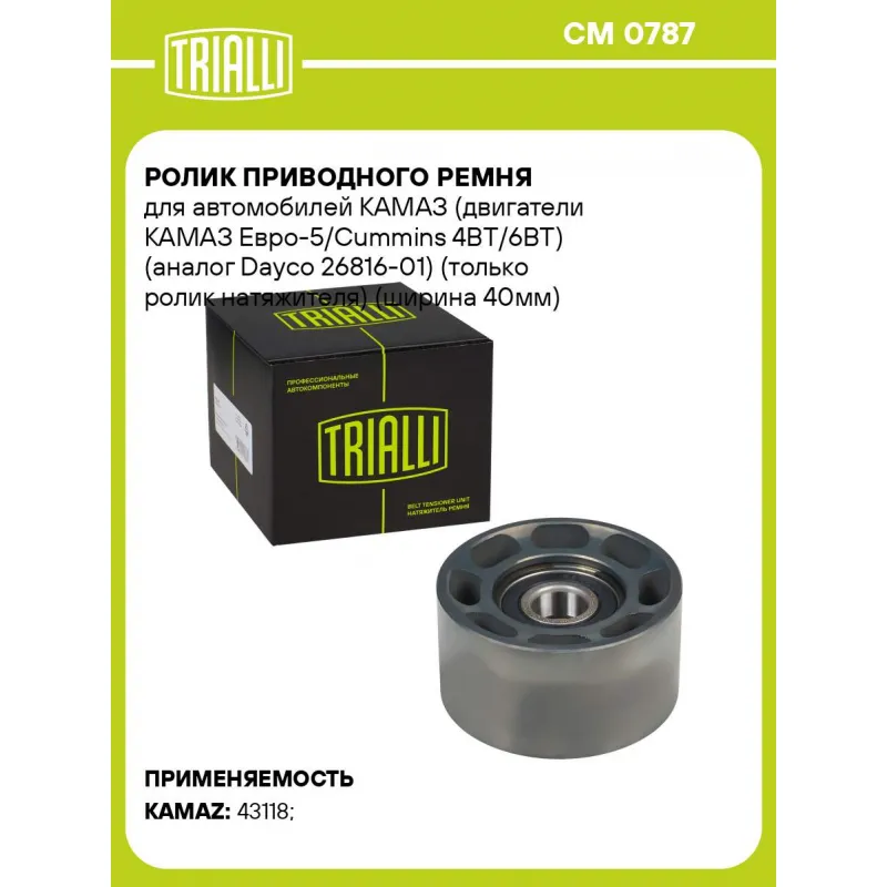 Ролик приводного ремня для автомобилей КАМАЗ (двигатели КАМАЗ Евро-5/Cummins 4BT/6BT) (аналог Dayco 26816-01) (только ролик натяжителя) (ширина 40мм) Характеристики: Артикул: CM 0787 OEM номера: 3937553, 3917485, 3934818, 3914086, 2686-01, 26816-01 Сопутствующие товары:: CM 101, CM 110, CM 111, CM 0778 Особенности конструкции:: с натяжителем Ширина, мм: 39,5 Внешний диаметр, мм: 74 Гарантийный срок: 2 года/60 000 км. Сопутствующий товар: Ролики приводного ремня: CM 101, CM 110, CM 111, CM 0778 Количество на автомобиль: 1 Материал: Комбинированный Товарная линейка: BLACK Комплектация: Ролик приводного ремня - 1 шт Гарантия: от 1 года.