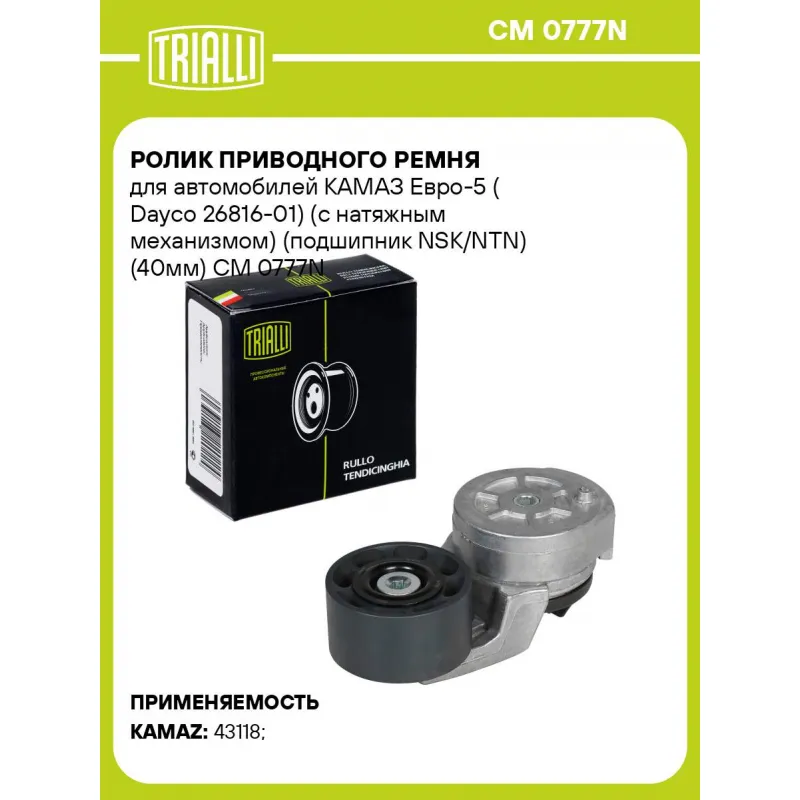 Ролик приводного ремня для автомобилей КАМАЗ Евро-5 (аналог Dayco 26816-01) (с натяжным механизмом) (подшипник NSK/NTN) (40мм) Характеристики: Артикул: CM 0777N OEM номера: 3937553, 3917485, 3934818, 3914086, 26816-01, 2686-01 Ширина, мм: 39.5 Внешний диаметр, мм: 74 Гарантийный срок: 2 года/80 000 км. Количество на автомобиль: ... Читать полностью →