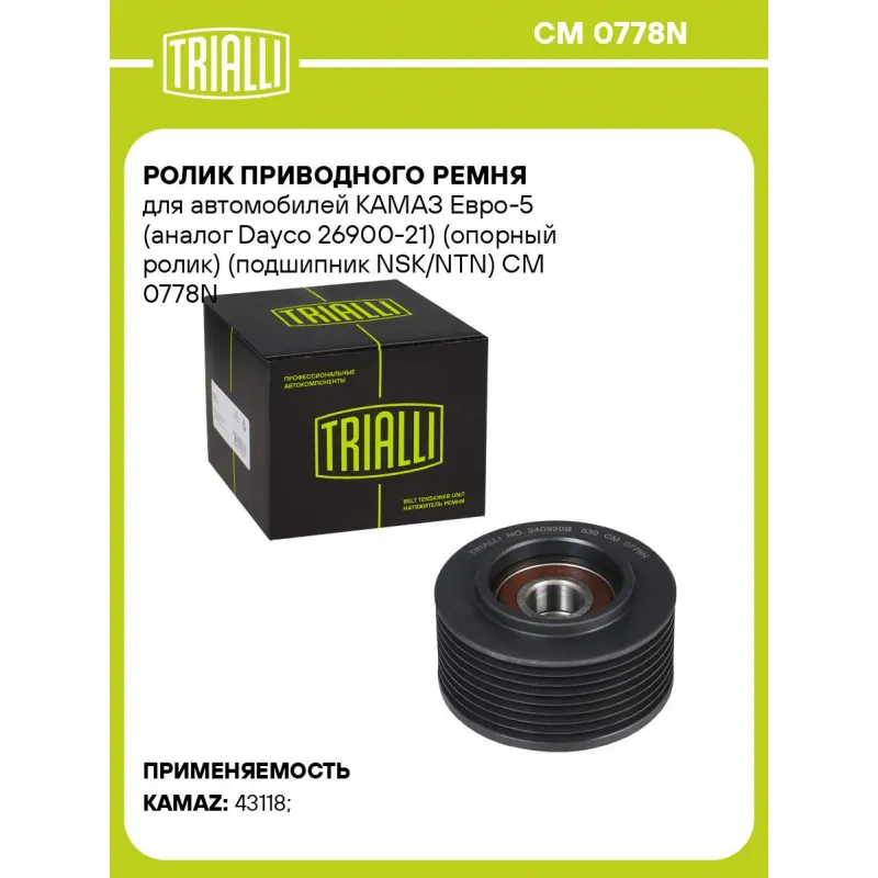 Ролик приводного ремня для автомобилей КАМАЗ Евро-5 (аналог Dayco 26900-21) (опорный ролик) (подшипник NSK/NTN) Характеристики: Артикул: CM 0778N OEM номера: 26900-21 Внешний диаметр, мм: 72.5 Гарантийный срок: 2 года/80 000 км. Количество на автомобиль: 1 Материал: Комбинированный Товарная линейка: BLACK Комплектация: Ролик приводного ремня - 1 шт Гарантия: от 1 года.