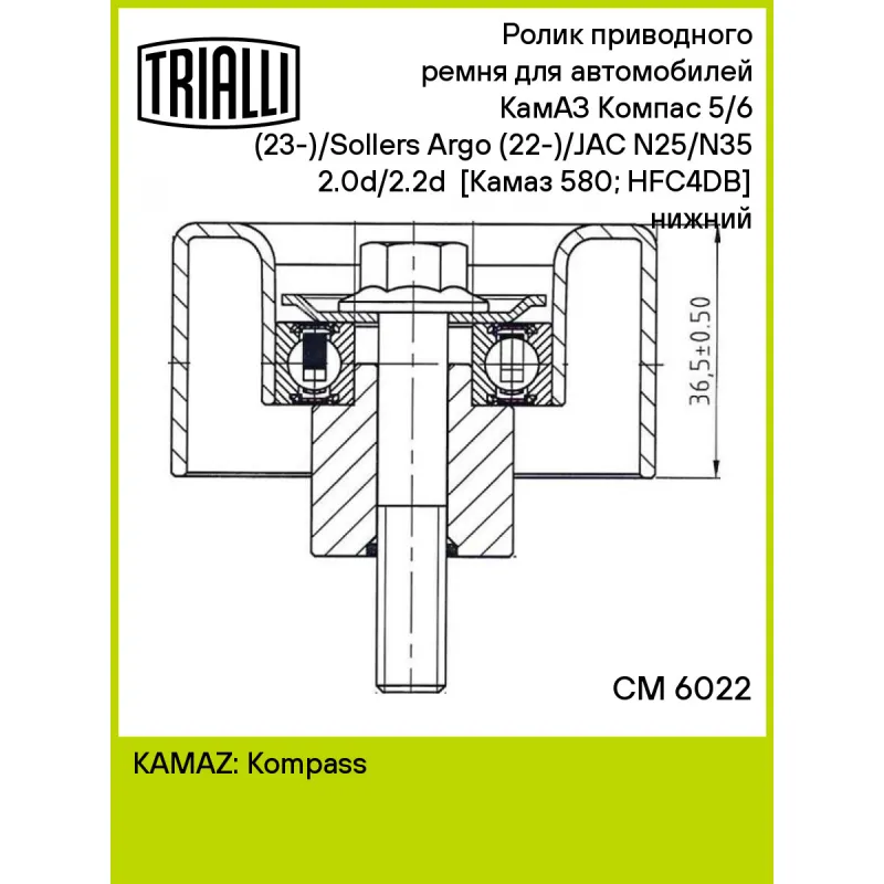 Ролик приводного ремня для автомобилей КамАЗ Компас 5/6 (23-)/Sollers Argo (22-)/JAC N25/N35 2.0d/2.2d [Камаз 580; HFC4DB] (опорный) нижний Характеристики: Артикул: CM 6022 OEM номера: 1025800FD020 Гарантийный срок: 2 года/60 000 км. Товарная линейка: BLACK Количество на автомобиль: 1 Материал: Комбинированный Комплектация: Ролик приводного ремня - 1 шт Гарантия: от 1 года.