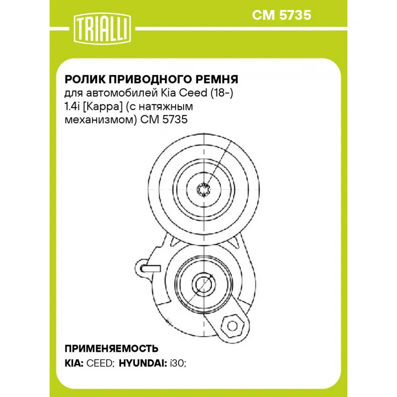 Ролик приводного ремня для автомобилей Kia Ceed (18-) 1.4i [Kappa] (с натяжным механизмом) Характеристики: Артикул: CM 5735 OEM номера: 25281-03821 Сопутствующий товар: Ролики приводного ремня: CM 5736 Количество на автомобиль: 1 Внешний диаметр, мм: 74,5 Ширина, мм: 26 Гарантийный срок: 2 года/60 000 км. Сопутствующий товар: Ремни: 6PK1660 Товарная линейка: BLACK Комплектация: Ролик привод. ремня с натяж. мех. - 1 шт Гарантия: от 1 года.