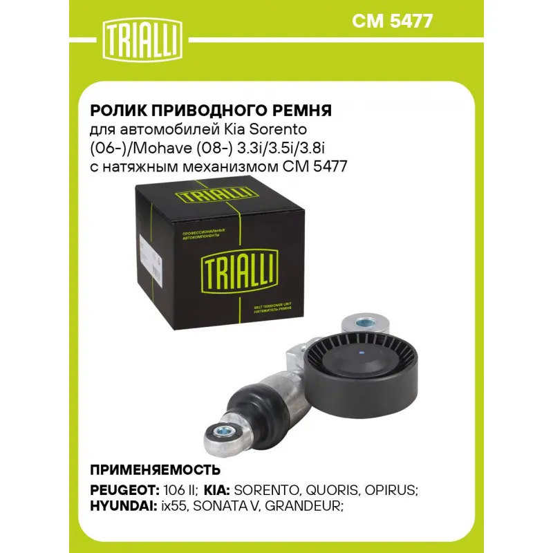 Ролик приводного ремня для автомобилей Kia Sorento (06-)/Mohave (08-) 3.3i/3.5i/3.8i с натяжным механизмом Характеристики: Артикул: CM 5477 OEM номера: 252813C100 Сопутствующий товар: Ролики приводного ремня: CM 5745 Количество на автомобиль: 1 Внешний диаметр, мм: 70 Ширина, мм: 26 Гарантийный срок: 2 года/60 000 км. Материал: Комбинированный Сопутствующий товар: Ремни: 6PK2475, 6PK1940 Товарная линейка: BLACK Комплектация: Ролик привод. ремня с натяж. мех. - 1 шт Гарантия: от 1 года.