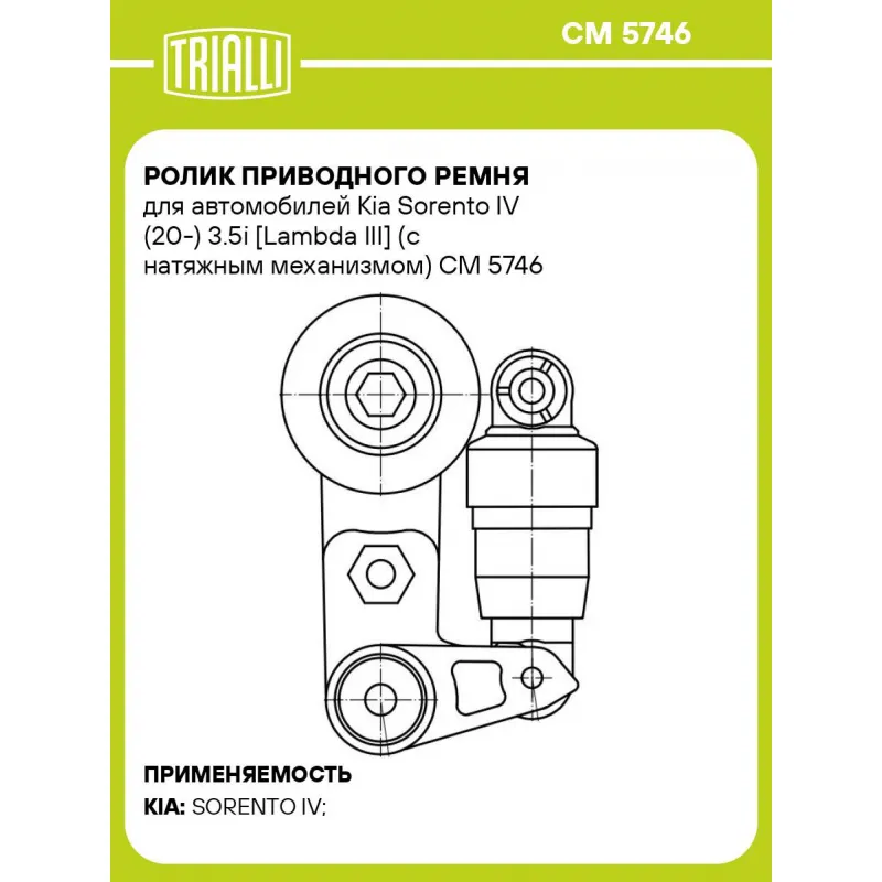 Ролик приводного ремня для автомобилей Kia Sorento IV (20-) 3.5i [Lambda III] (с натяжным механизмом) Характеристики: Артикул: CM 5746 OEM номера: 25281-3N300 Ширина, мм: 28,8 Внешний диаметр, мм: 65 Сопутствующий товар: Ролики приводного ремня: CM 5447 Сопутствующий товар: Ремни: 6PK1940 Количество на автомобиль: 1 Гарантийный ... Читать полностью →