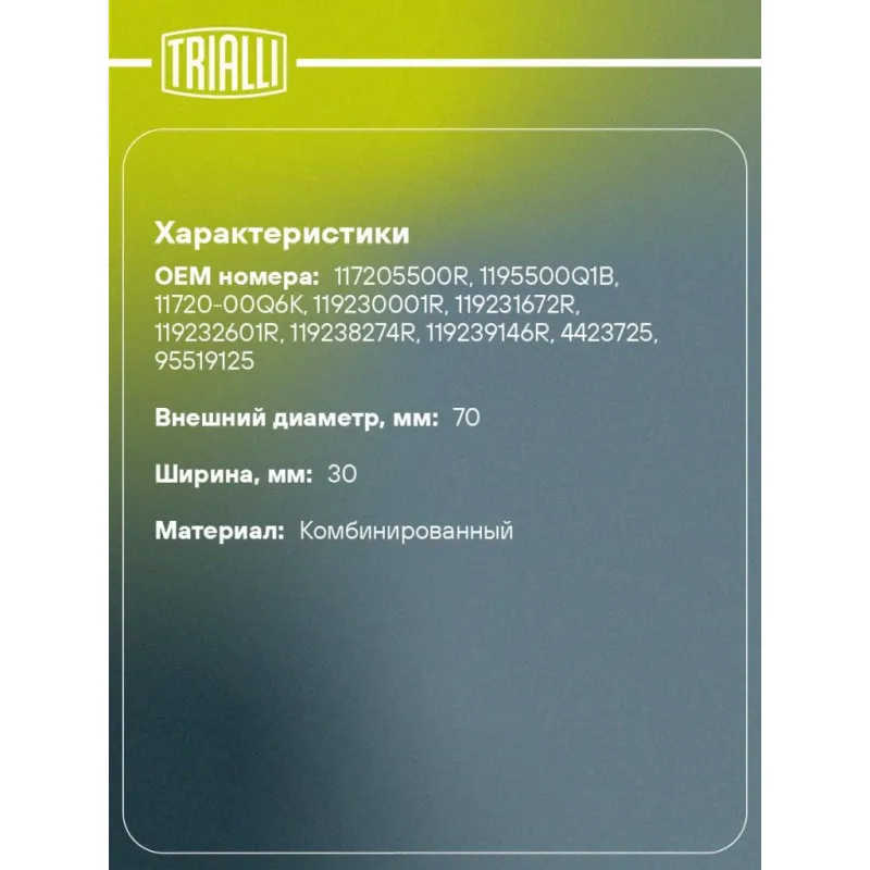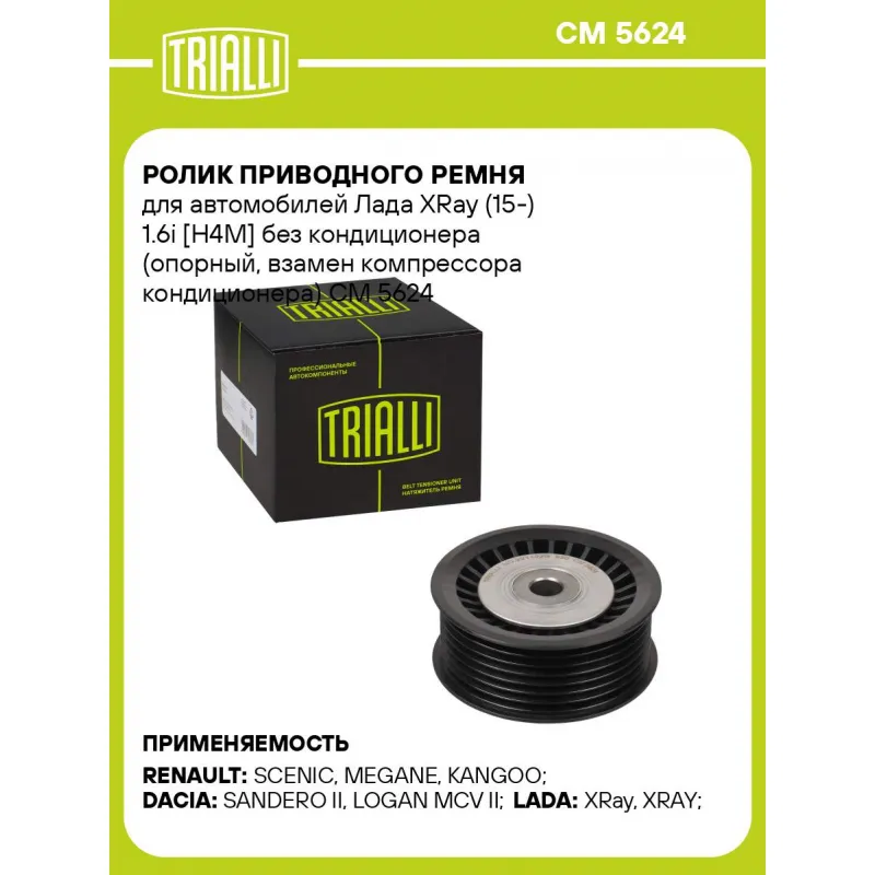 Ролик приводного ремня для автомобилей Лада XRay (15-) 1.6i [H4M] без кондиционера (опорный, взамен компрессора кондиционера) Характеристики: Артикул: CM 5624 OEM номера: 117205500R, 1195500Q1B, 11720-00Q6K, 119230001R, 119231672R, 119232601R, 119238274R, 119239146R, 4423725, 95519125 Сопутствующие товары:: 7PK1570,CM 5640 Сопутствующий товар: Ролики приводного ремня: CM 5640 Количество на автомобиль: 1 Внешний диаметр, мм: 70 Внутренний диаметр, мм: 10 Ширина, мм: 30 Гарантийный срок: 2 года/60 000 км. Сопутствующий товар: Ремни: 7PK1570, Товарная линейка: BLACK Комплектация: Ролик приводного ремня - 1 шт Гарантия: от 1 года.