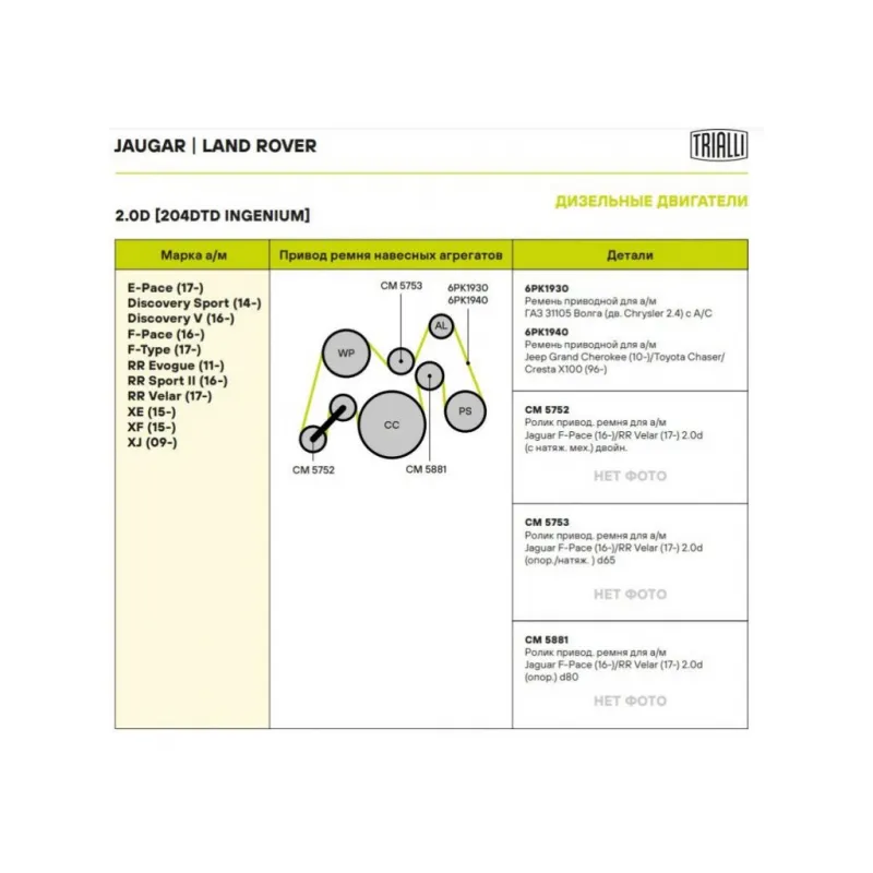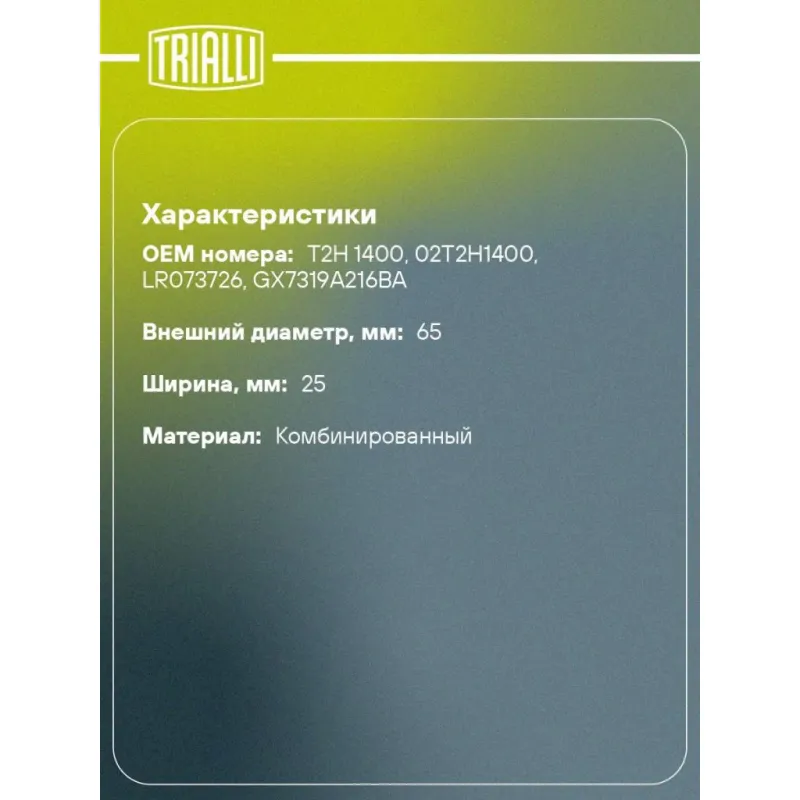 Ролик приводного ремня для автомобилей Land Rover Evoque (11-)/Discovery Sport (14-) 2.0i/2.0d (опорный) d65 Характеристики: Артикул: CM 5753 OEM номера: T2H 1400, 02T2H1400, LR073726, GX7319A216BA Количество на автомобиль: 1 Внешний диаметр, мм: 65 Внутренний диаметр, мм: 8 Ширина, мм: 25 Гарантийный срок: 2 года/60 000 км. Материал: Комбинированный Товарная линейка: BLACK Комплектация: Ролик приводного ремня - 1 шт Гарантия: от 1 года.