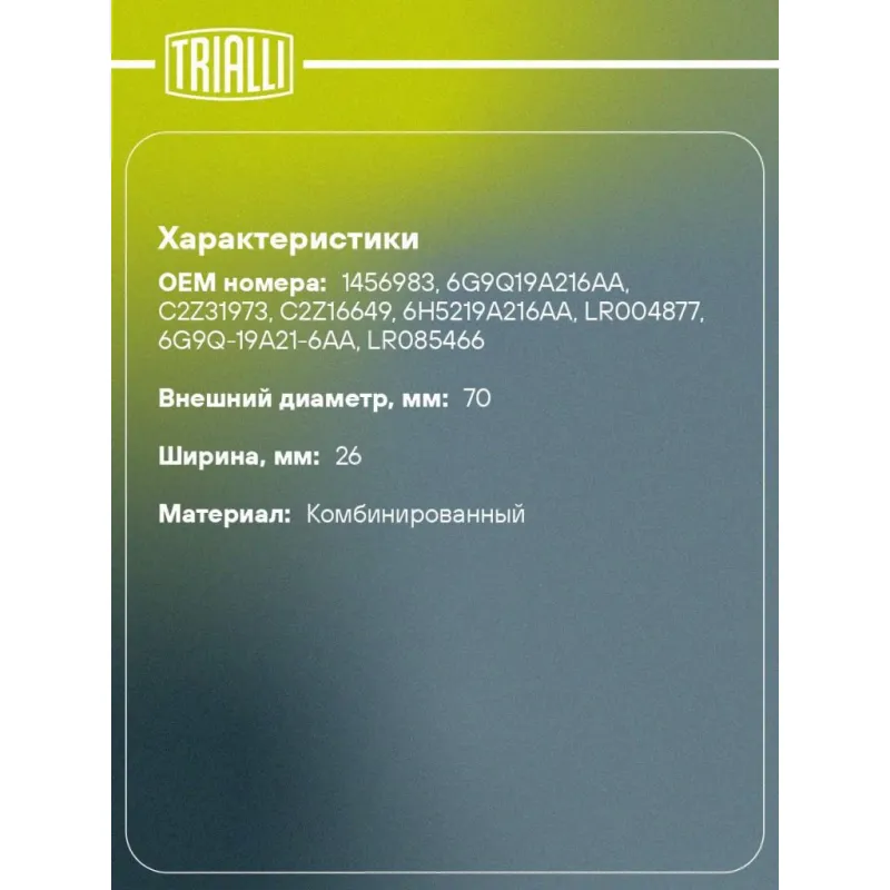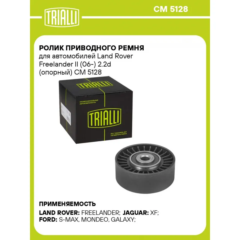 Ролик приводного ремня для автомобилей Land Rover Freelander II (06-) 2.2d (опорный) Характеристики: Артикул: CM 5128 OEM номера: 1456983, 6G9Q19A216AA, C2Z31973, C2Z16649, 6H5219A216AA, LR004877, 6G9Q-19A21-6AA, LR085466 Сопутствующие товары:: 6PK1845, 6PK1743, 6PK1217, 6PK1270, CM 5399, CM 5306, CM 5728, CM 5727 Сопутствующий товар: Ролики приводного ремня: CM 5399, CM 5306, CM 5728, CM 5727 Количество на автомобиль: 1 Внешний диаметр, мм: 70 Внутренний диаметр, мм: 10 Ширина, мм: 26 Гарантийный срок: 2 года/60 000 км. Сопутствующий товар: Ремни: 6PK1845, 6PK1743, 6PK1217, 6PK1270 Товарная линейка: BLACK Комплектация: Ролик приводного ремня - 1 шт Гарантия: от 1 года.
