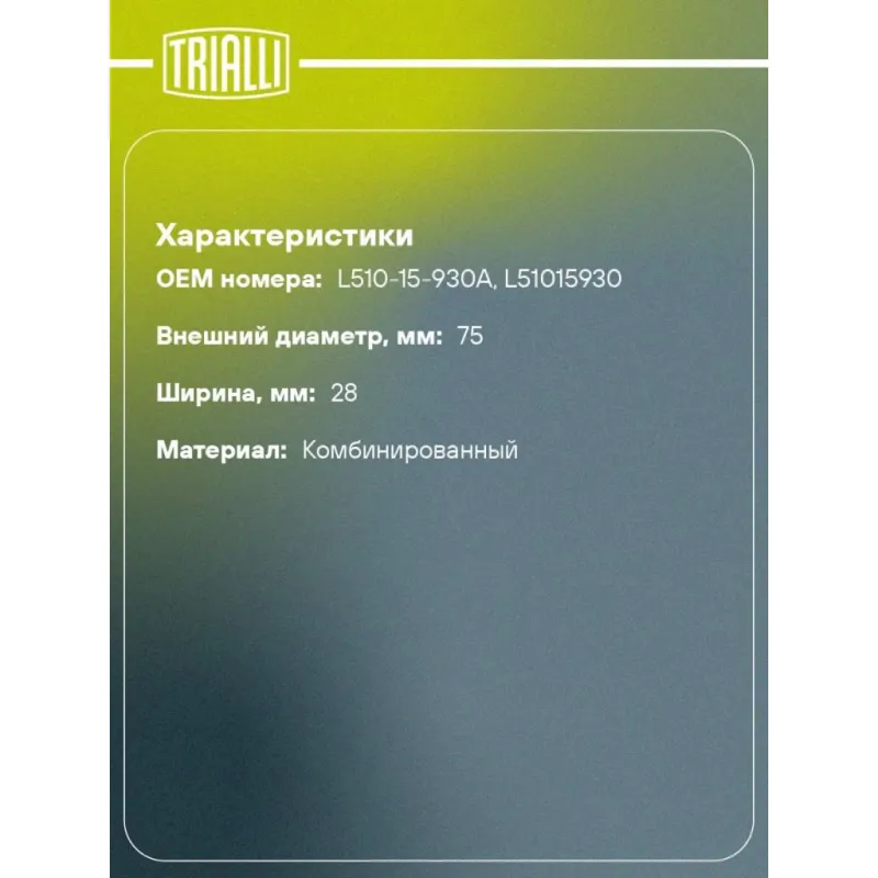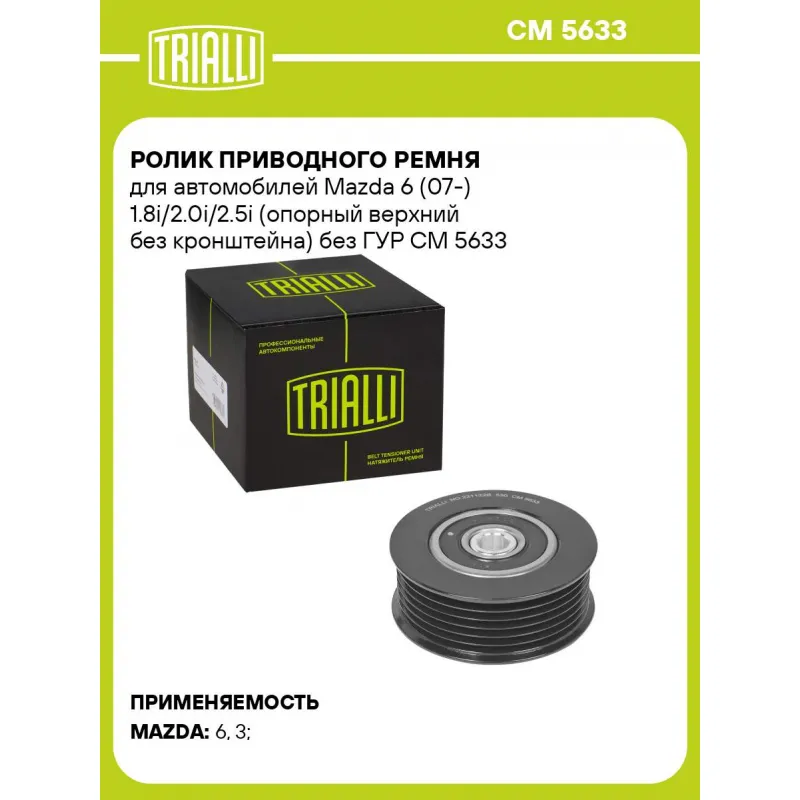 Ролик приводного ремня для автомобилей Mazda 6 (07-) 1.8i/2.0i/2.5i (опорный верхний без кронштейна) без ГУР Характеристики: Артикул: CM 5633 OEM номера: L510-15-930A, L51015930 Сопутствующие товары:: 6PK1190, CM 5625, CM 2504, CMS 1206, CM 1206,6PK2236 Сопутствующий товар: Ролики приводного ремня: CM 5625, CM 2504, CMS 1206, CM 1206 Количество на автомобиль: 1 Внешний диаметр, мм: 75 Внутренний диаметр, мм: 17 Ширина, мм: 28 Гарантийный срок: 2 года/60 000 км. Сопутствующий товар: Ремни: 6PK11906PK2236 Товарная линейка: BLACK Комплектация: Ролик привод. ремня - 1 шт Гарантия: от 1 года.