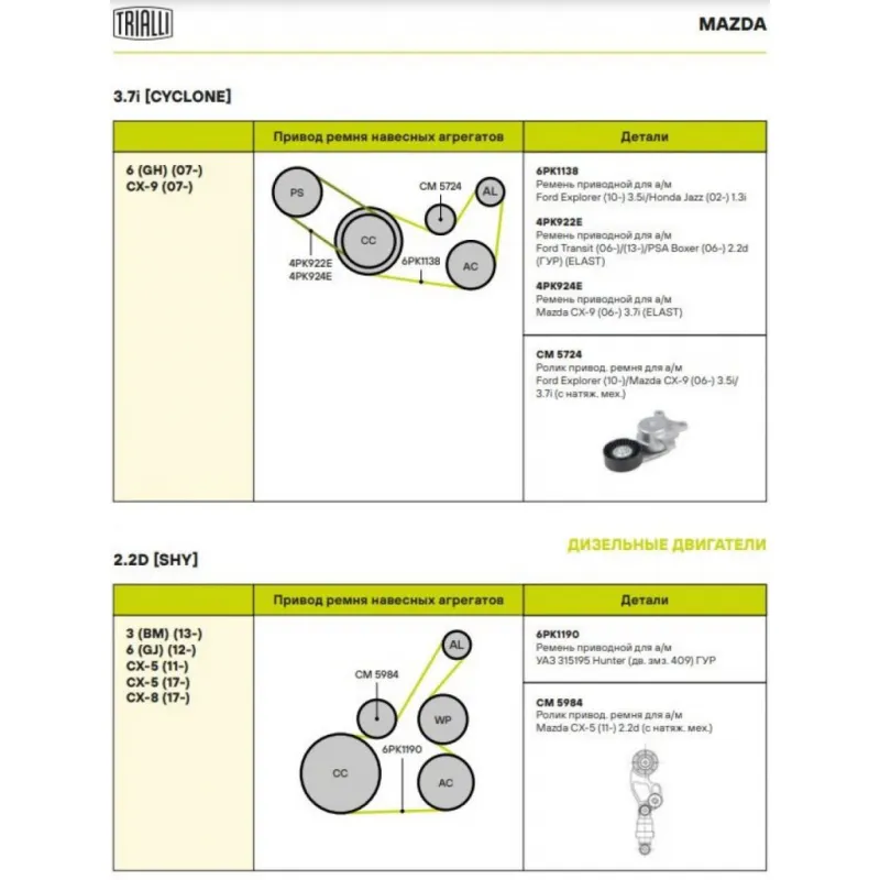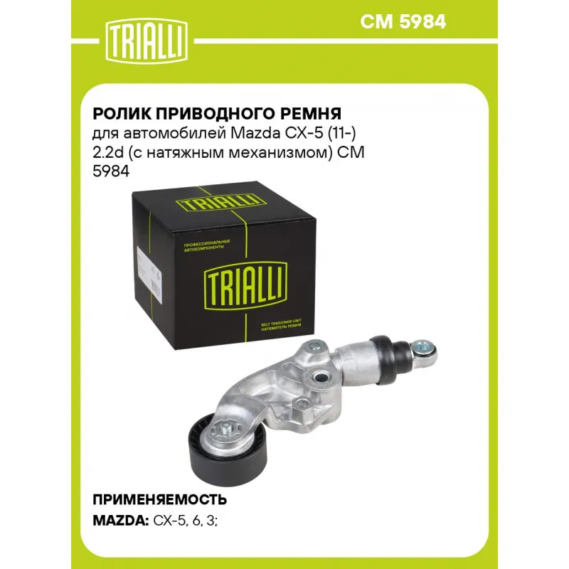 Ролик приводного ремня для автомобилей Mazda CX-5 (11-) 2.2d (с натяжным механизмом) Характеристики: Артикул: CM 5984 OEM номера: SH01-15-980D, SH0115980C Сопутствующие товары:: 6PK1190 Ширина, мм: 26 Внешний диаметр, мм: 60 Внутренний диаметр, мм: 10,2 Гарантийный срок: 2 года/60 000 км. Количество на автомобиль: 1 Материал: Комбинированный Товарная линейка: BLACK Комплектация: Ролик привод. ремня с натяж. мех. - 1 шт Гарантия: от 1 года.
