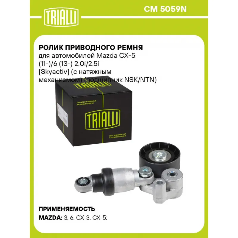 Ролик приводного ремня для автомобилей Mazda CX-5 (11-)/6 (13-) 2.0i/2.5i [Skyactiv] (с натяжным механизмом) (подшипник NSK/NTN) Характеристики: Артикул: CM 5059N OEM номера: PE03-15-980B, PE0315980, PE0315980A, PET215980 Ширина, мм: 42 Внешний диаметр, мм: 65 Гарантийный срок: 2 года/80 000 км. Количество на автомобиль: 1 Матер... Читать полностью →