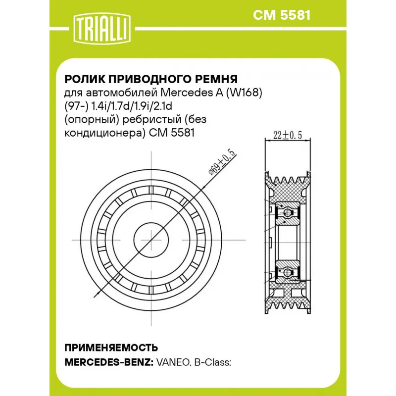 Ролик приводного ремня для автомобилей Mercedes A (W168) (97-) 1.4i/1.7d/1.9i/2.1d (опорный) ребристый (без кондиционера) Характеристики: Артикул: CM 5581 OEM номера: 166 202 03 19, 166 202 07 19, 640 202 03 19, A 668 202 03 19, A 166 202 07 19, A 166 202 03 19, A 640 202 03 19, 668 202 03 19 Сопутствующие товары:: CM 5110, CM 7157, 5PK1285, 5PK1720, 5PK1265 Количество на автомобиль: 1 Внешний диаметр, мм: 69 Внутренний диаметр, мм: 17 Ширина, мм: 22 Гарантийный срок: 2 года/60 000 км. Материал: Комбинированный Товарная линейка: BLACK Комплектация: Ролик приводного ремня - 1 шт Гарантия: от 1 года.
