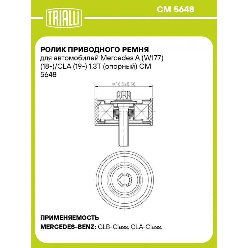Ролик приводного ремня для автомобилей Mercedes A (W177) (18-)/СLA (19-) 1.3T (опорный) Характеристики: Артикул: CM 5648 OEM номера: A 282 202 00 19, 282 202 00 19 Сопутствующие товары:: CM 5645, 5PK1255 Гарантийный срок: 2 года/60 000 км. Товарная линейка: BLACK Количество на автомобиль: 1 Материал: Комбинированный Комплектация: Ролик приводного ремня - 1 шт Гарантия: от 1 года.