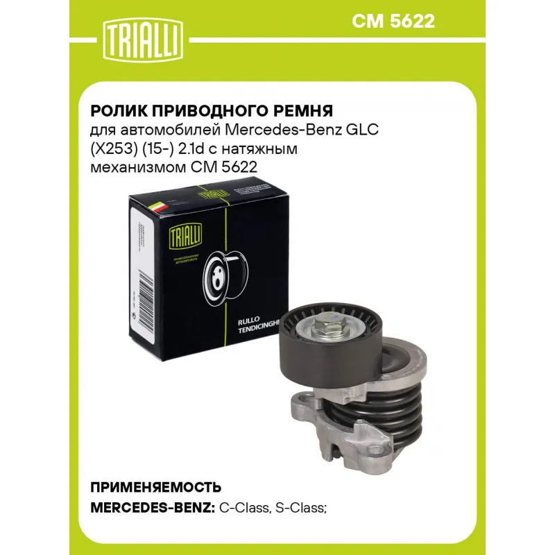 Ролик приводного ремня для автомобилей Mercedes-Benz GLC (X253) (15-) 2.1d с натяжным механизмом Характеристики: Артикул: CM 5622 OEM номера: A 6512002470, A 6512002270, A6512002570, A6512007501, 6512002270, 6512002570, 6512007501, 6512002470 Сопутствующие товары:: 6PK1642, CM 5118, CM 5637 Сопутствующий товар: Ролики приводного ремня: CM 5118, CM 5637 Количество на автомобиль: 1 Внешний диаметр, мм: 55 Ширина, мм: 26 Гарантийный срок: 2 года/60 000 км. Сопутствующий товар: Ремни: 6PK1642 Товарная линейка: BLACK Комплектация: Ролик привод. ремня. с натяж. мех. - 1 шт Гарантия: от 1 года.