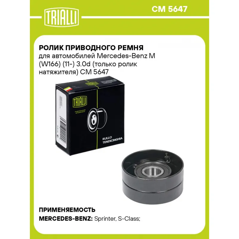 Ролик приводного ремня для автомобилей Mercedes-Benz M (W166) (11-) 3.0d (только ролик натяжителя) Характеристики: Артикул: CM 5647 OEM номера: A 642 200 19 70, 6422001970 Количество на автомобиль: 1 Внешний диаметр, мм: 65 Внутренний диаметр, мм: 11 Ширина, мм: 30 Гарантийный срок: 2 года/60 000 км. Материал: Комбинированный То... Читать полностью →