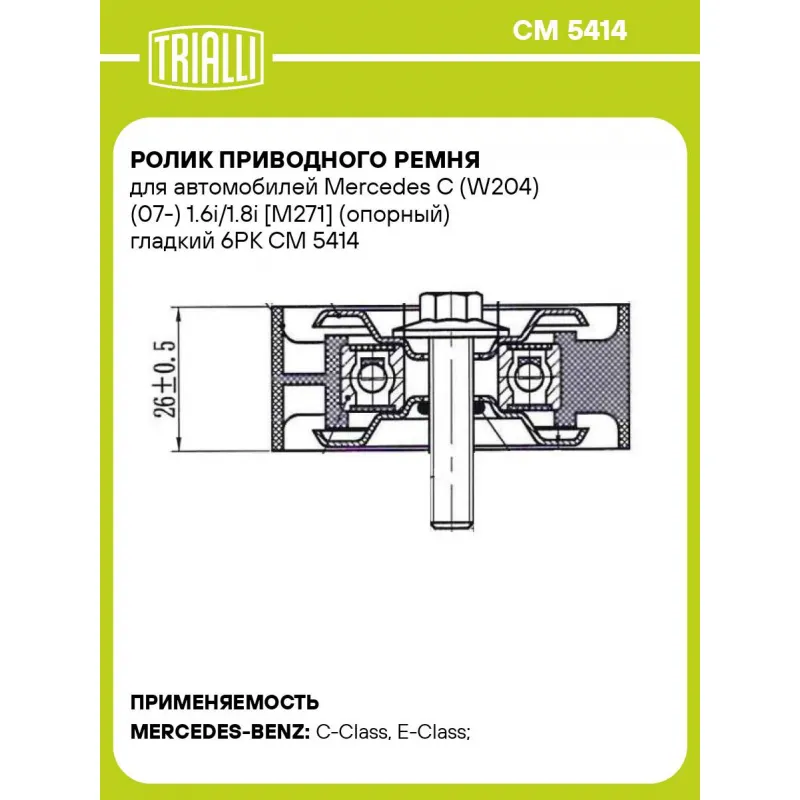 Ролик приводного ремня для автомобилей Mercedes C (W204) (07-) 1.6i/1.8i [M271] (опорный) гладкий 6PK Характеристики: Артикул: CM 5414 OEM номера: 0002021719, A0002021719 Сопутствующие товары:: CM 5403, CM 5170, CM 5114, CM 6889, CM 5387, CM 5416, 7PK2418, 7PK2315, 6PK2315 Товарная линейка: BLACK Количество на автомобиль: 1 Внешний диаметр, мм: 65 Ширина, мм: 26 Гарантийный срок: 2 года/60 000 км. Материал: Комбинированный Комплектация: Ролик приводного ремня - 1 шт Гарантия: от 1 года.