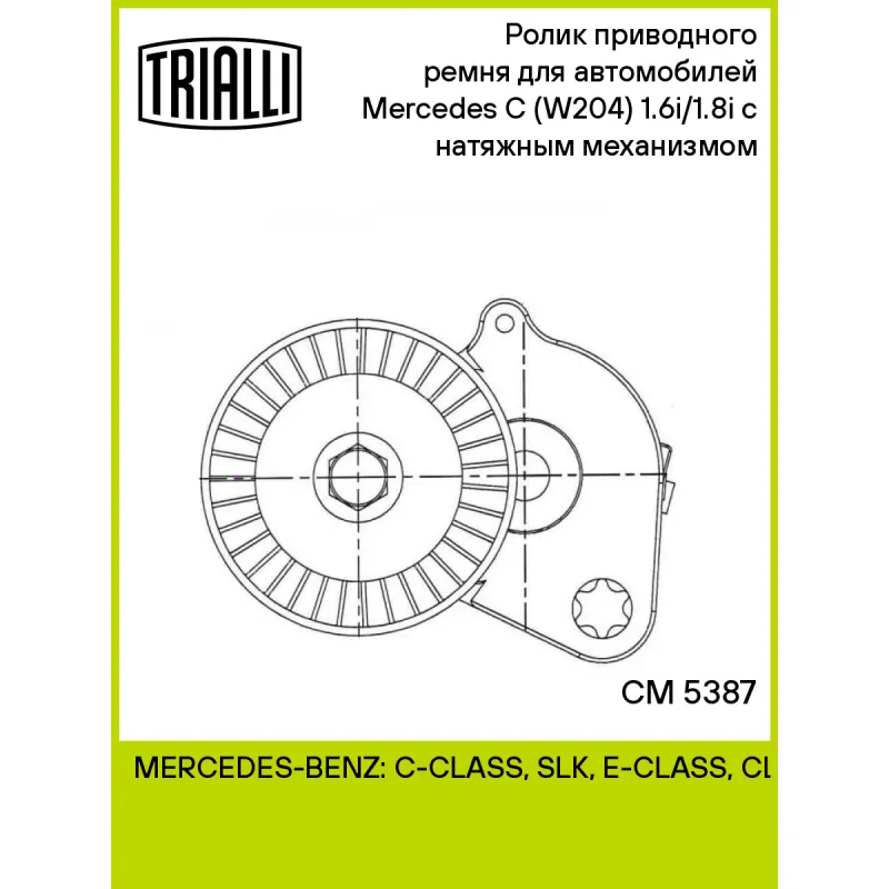 Ролик приводного ремня для автомобилей Mercedes C (W204) (07-) 1.6i/1.8i с натяжным механизмом Характеристики: Артикул: CM 5387 OEM номера: 2712000470, A2712000470 Сопутствующие товары:: CM 5403, CM 5170, CM 5114, CM 6889, CM 5414, CM 5416, 7PK2418, 7PK2315, 6PK2315 Ширина, мм: 28 Внешний диаметр, мм: 76 Товарная линейка: BLACK Количество на автомобиль: 1 Гарантийный срок: 2 года/60 000 км. Материал: Комбинированный Комплектация: Ролик приводного ремня - 1 шт Гарантия: от 1 года.