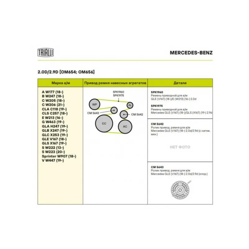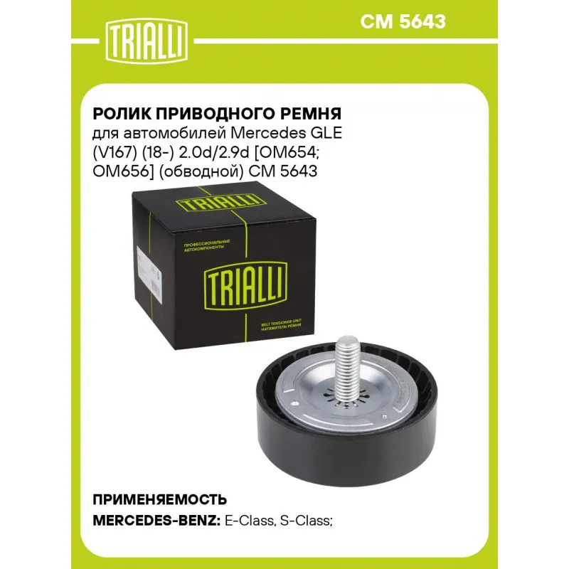 Ролик приводного ремня для автомобилей Mercedes GLE (V167) (18-) 2.0d/2.9d [OM654; OM656] (обводной) Характеристики: Артикул: CM 5643 OEM номера: A 6542020019, 6542020019 Количество на автомобиль: 1 Внешний диаметр, мм: 70.3 Внутренний диаметр, мм: 17 Ширина, мм: 22.3 Гарантийный срок: 2 года/60 000 км. Материал: Комбинированный... Читать полностью →