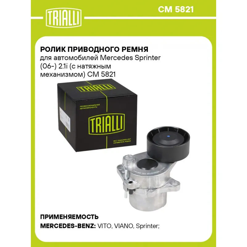 Ролик приводного ремня для автомобилей Mercedes Sprinter (06-) 2.1i (с натяжным механизмом) Характеристики: Артикул: CM 5821 OEM номера: A6512001870, A6512000470, 6512001870, 6512000470 Ширина, мм: 26 Внешний диаметр, мм: 65 Внутренний диаметр, мм: 8,2 Количество на автомобиль: 1 Гарантийный срок: 2 года/60 000 км. Материал: Ком... Читать полностью →