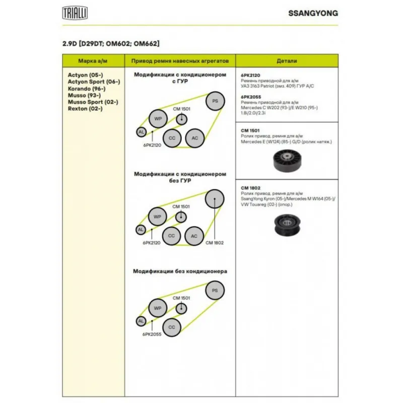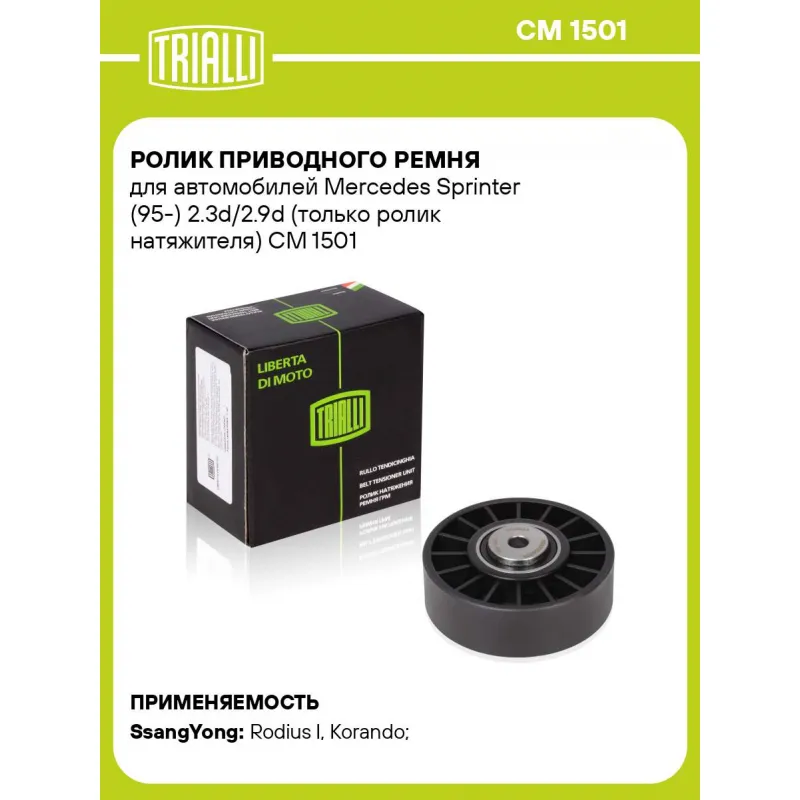 Ролик приводного ремня для автомобилей Mercedes Sprinter (95-) 2.3d/2.9d (только ролик натяжителя) Характеристики: Артикул: CM 1501 OEM номера: 6012001970, A6012000970, 062145278, A6012001970, 102 200 6970, A102 200 69 70, 102 200 34 70, A 102 200 66 70, 102 200 75 70, 102 200 77 70, A 102 200 12 70, A 102 200 33 70, A 102 200 34 70, A 102 200 60 70, A102 200 77 70, A102 200 75 70, 102 200 12 70, 102 200 33 70, 102 200 60 70, 102 200 66 70, 6012000970, 6612003070, 62145278 Количество на автомобиль: 1 Сопутствующие товары:: CM 5322, 6PK2140, 6PK2100, 6PK2120, 6PK2150, 6PK2130, 6PK2080, 6PK2030, 6PK2050, 6PK2065 Внешний диаметр, мм: 80 Особенности конструкции:: приводного ремня Внутренний диаметр, мм: 8,2 Ширина, мм: 25 Гарантийный срок: 2 года/60 000 км. Материал: Комбинированный Товарная линейка: BLACK Подходит для авто: SsangYong Rodius I (04-), Korando (95-) Для проверки применяемости отправьте VIN автомобиля через вкладку "Есть вопросы о товаре?" Комплектация: Ролик приводного ремня - 1 шт Гарантия: от 1 года.