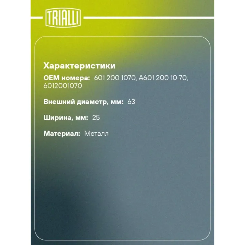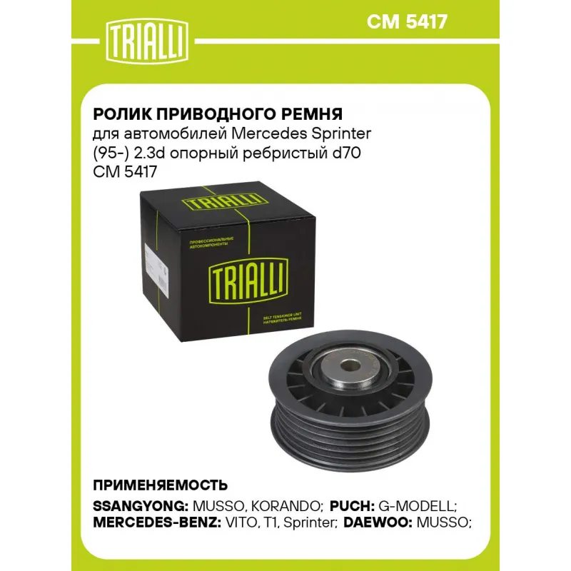 Ролик приводного ремня для автомобилей Mercedes Sprinter (95-) 2.3d опорный ребристый d70 Характеристики: Артикул: CM 5417 OEM номера: 601 200 1070, A601 200 10 70, 6012001070 Сопутствующие товары:: CM 5405, CM 5405, CM 5317, CM 5356, CM 5986, CM 5987, CM 5392, 6PK2415, 6PK2445, 6PK2380, 8PK2450, 6PK2257, 6PK2285, 6PK2330, 6PK2360, 6PK2175, 6PK2205 Количество на автомобиль: 1 Внешний диаметр, мм: 63 Внутренний диаметр, мм: 8 Ширина, мм: 25 Гарантийный срок: 2 года/60 000 км. Материал: Металл Товарная линейка: BLACK Комплектация: Ролик приводного ремня - 1 шт Гарантия: от 1 года.