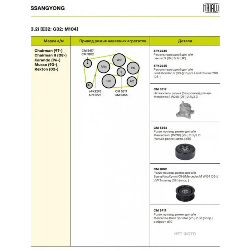 | Сопутствующие товары: | CM 5405, CM 5405, CM 5317, CM 5356, CM 5986, CM 5987, CM 5392, 6PK2415, 6PK2445, 6PK2380, 8PK2450, 6PK2257, 6PK2285, 6PK2330, 6PK2360, 6PK2175, 6PK2205 |