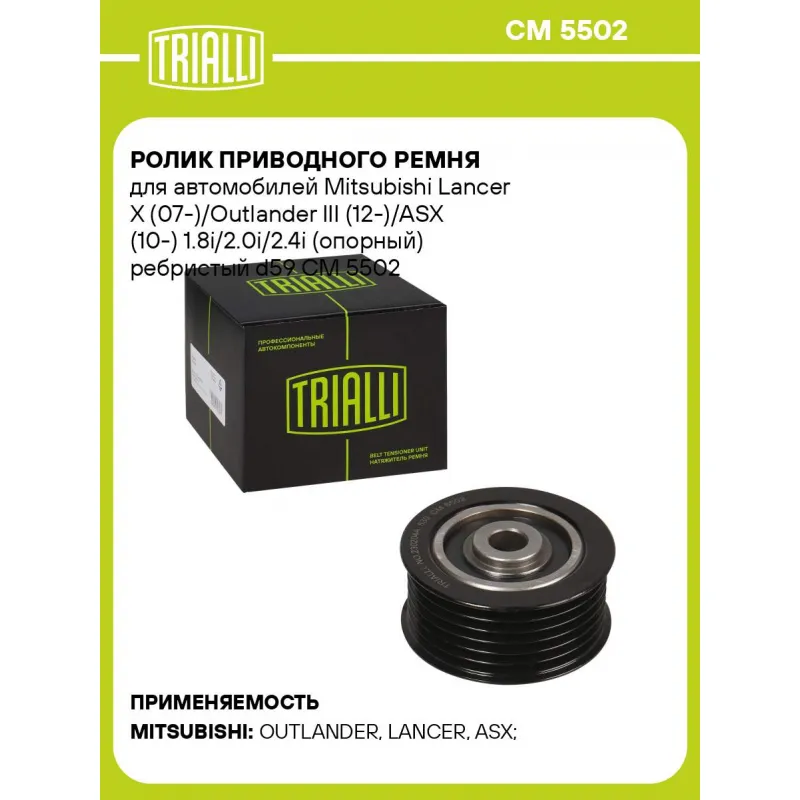 Ролик приводного ремня для автомобилей Mitsubishi Lancer X (07-)/Outlander III (12-)/ASX (10-) 1.8i/2.0i/2.4i (опорный) ребристый d59 Характеристики: Артикул: CM 5502 OEM номера: 1341A042, 1607664380, 1611423680 Сопутствующие товары:: CM 558, CM 5638 Сопутствующий товар: Ролики приводного ремня: CM 558, CM 5638 Количество на автомобиль: 1 Внешний диаметр, мм: 56 Внутренний диаметр, мм: 10 Ширина, мм: 26 Гарантийный срок: 2 года/60 000 км. Материал: Металл Товарная линейка: BLACK Комплектация: Ролик приводного ремня - 1 шт Гарантия: от 1 года.