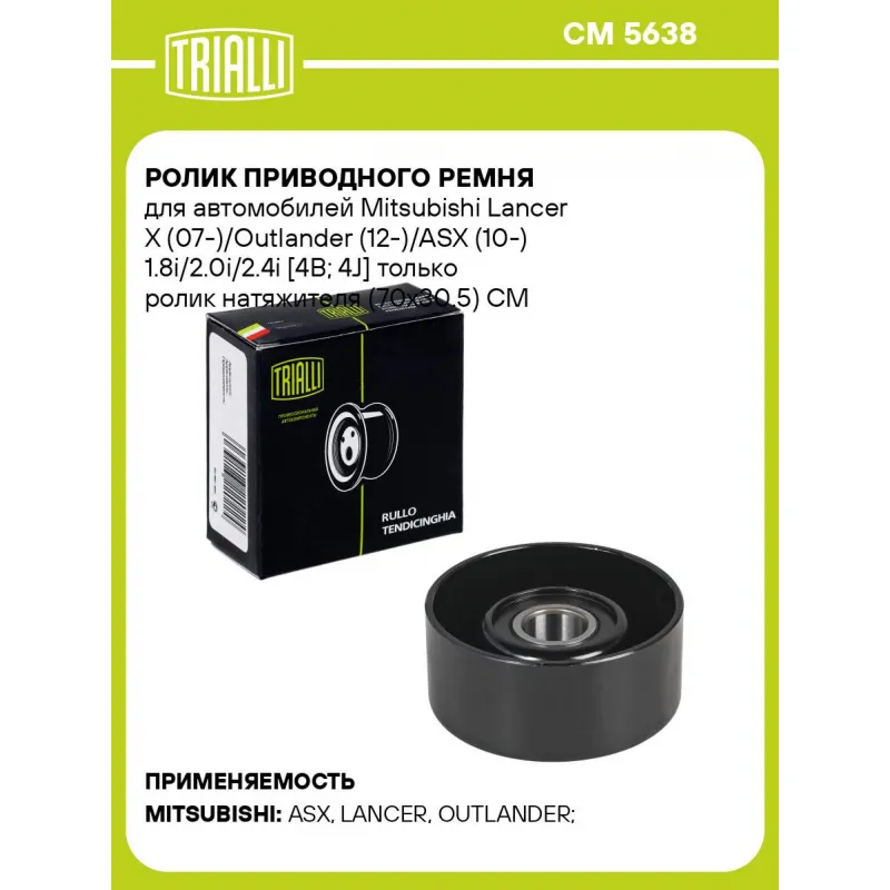 Ролик приводного ремня для автомобилей Mitsubishi Lancer X (07-)/Outlander (12-)/ASX (10-) 1.8i/2.0i/2.4i [4B; 4J] только ролик натяжителя (70x30.5) Характеристики: Артикул: CM 5638 OEM номера: 1345A090 Сопутствующие товары:: CM 1101, 6PK2625, CM 5558 Сопутствующий товар: Ролики приводного ремня: CM 1101, CM 5558 Количество на автомобиль: 1 Внешний диаметр, мм: 70 Ширина, мм: 30,5 Гарантийный срок: 2 года/60 000 км. Сопутствующий товар: Ремни: 6PK2625 Товарная линейка: BLACK Комплектация: Ролик привод. ремня - 1 шт Гарантия: от 1 года.