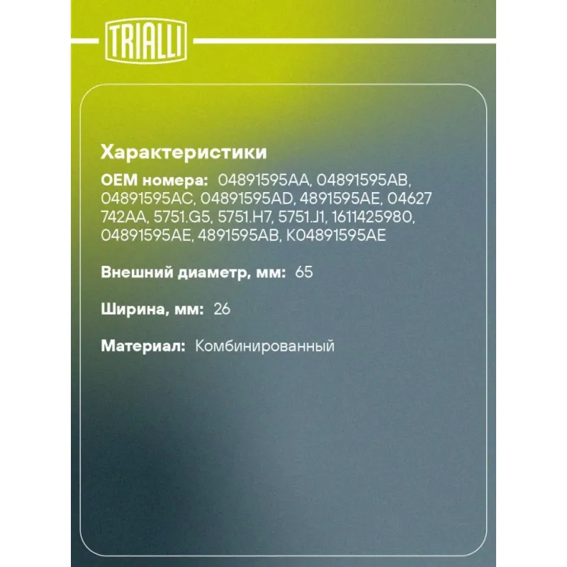 Ролик приводного ремня для автомобилей Mitsubishi Lancer X (07-) 1.8i/2.0i/2.4i (с натяжным механизмом) (подшипник NSK/NTN) (65x26) Характеристики: Артикул: CM 1103N OEM номера: 04891595AA, 04891595AB, 04891595AC, 04891595AD, 4891595AE, 04627 742AA, 5751.G5, 5751.H7, 5751.J1, 1611425980, 04891595AE, 4891595AB, K04891595AE, 1345A008, 1345A059, 1345A060, 1345A079, 1345A051, 1345A052 Ширина, мм: 26 Внешний диаметр, мм: 65 Гарантийный срок: 2 года/80 000 км. Количество на автомобиль: 1 Материал: Комбинированный Товарная линейка: BLACK Комплектация: Ролик привод. ремня с натяж. мех. - 1 шт Гарантия: от 1 года.
