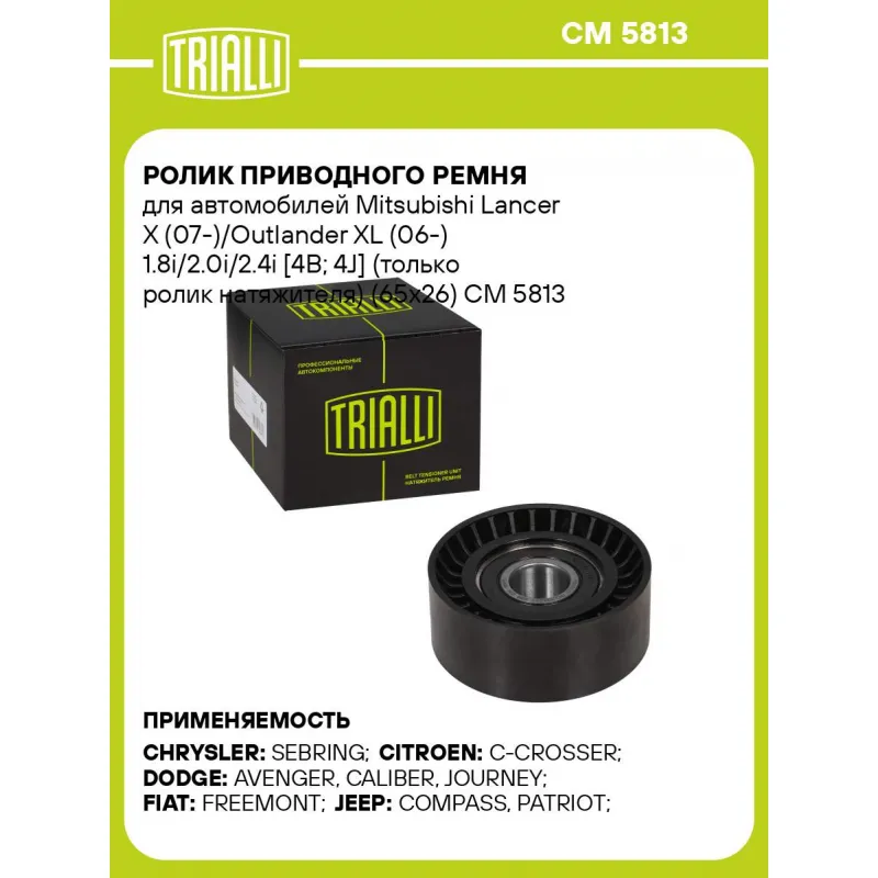 Ролик приводного ремня для автомобилей Mitsubishi Lancer X (07-)/Outlander XL (06-) 1.8i/2.0i/2.4i [4B; 4J] (только ролик натяжителя) (65x26) Характеристики: Артикул: CM 5813 OEM номера: 04891595AA, 04891595AB, 04891595AC, 04891595AD, 4891595AE, 04627 742AA, 5751.G5, 5751.H7, 5751.J1, 1611425980, 04891595AE, 4891595AB, K04891595AE, 1345A008, 1345A059, 1345A060, 1345A079, 1345A051, 1345A052 Сопутствующие товары:: 6PK2020, CM 1103, CM 1101 Сопутствующий товар: Ролики приводного ремня: CM 1103, CM 1101 Сопутствующий товар: Ремни: 6PK2020 Количество на автомобиль: 1 Внешний диаметр, мм: 65 Внутренний диаметр, мм: 17 Ширина, мм: 24.5 Гарантийный срок: 2 года/60 000 км. Материал: Комбинированный Товарная линейка: BLACK Комплектация: Ролик приводного ремня - 1 шт Гарантия: от 1 года.