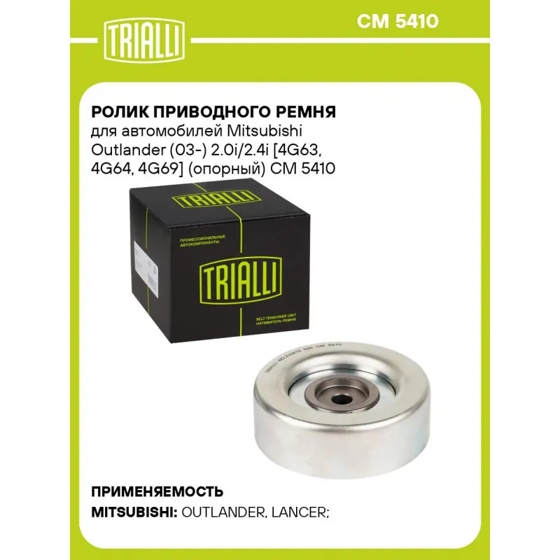 Ролик приводного ремня для автомобилей Mitsubishi Outlander (03-) 2.0i/2.4i [4G63, 4G64, 4G69] (опорный) Характеристики: Артикул: CM 5410 OEM номера: MD 374877 Количество на автомобиль: 1 Внешний диаметр, мм: 90 Внутренний диаметр, мм: 10,2 Ширина, мм: 30 Гарантийный срок: 2 года/60 000 км. Материал: Металл Товарная линейка: BLA... Читать полностью →