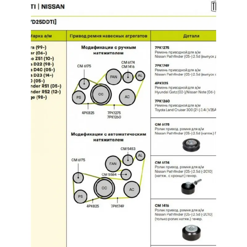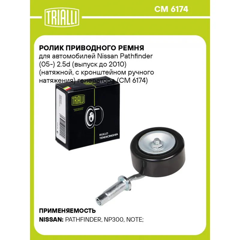 Ролик приводного ремня для автомобилей Nissan Pathfinder (05-) 2.5d (выпуск до 2010) (натяжной, с кронштейном ручного натяжения) генератора (CM 6174) CM 6174 TRIALLI