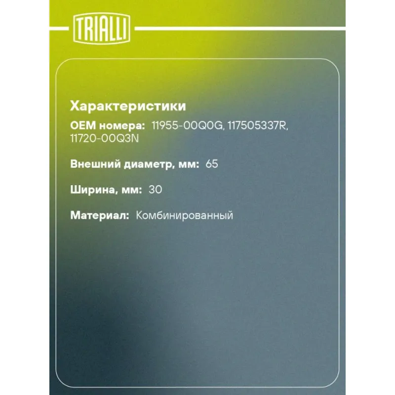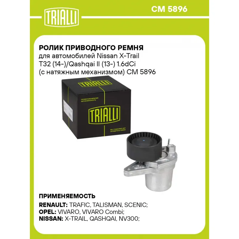 Ролик приводного ремня для автомобилей Nissan X-Trail T32 (14-)/Qashqai II (13-) 1.6dCi (с натяжным механизмом) Характеристики: Артикул: CM 5896 OEM номера: 11955-00Q0G, 117505337R, 11720-00Q3N Ширина, мм: 30 Внешний диаметр, мм: 65 Внутренний диаметр, мм: 8.2 Товарная линейка: BLACK Количество на автомобиль: 1 Гарантийный срок: 2 года/60 000 км. Материал: Комбинированный Комплектация: Ролик привод. ремня с натяж. мех. - 1 шт Гарантия: от 1 года.